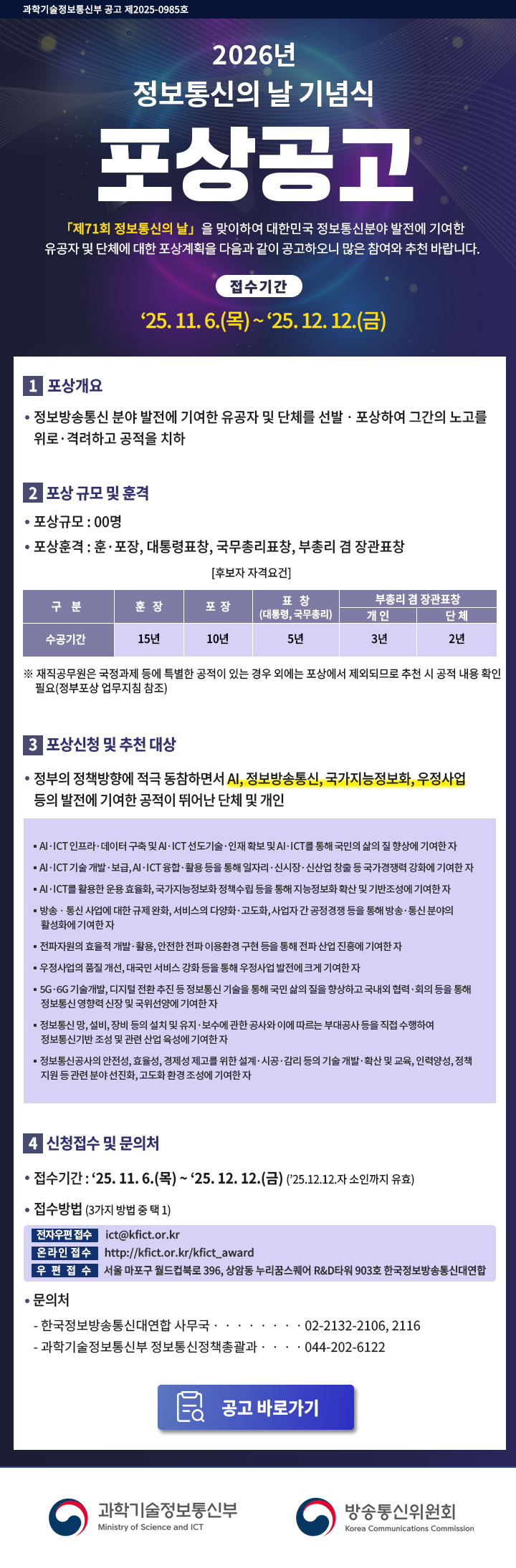 대한민국 정보통신 발전에 기여한 유공자 및 단체에 대한 정부포상 공고가 시작되었습니다.