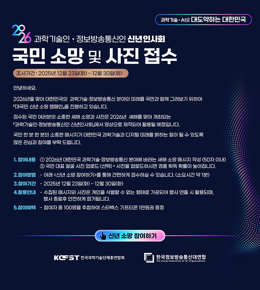 [과총] 2026년 과학기술인·정보방송통신인 신년인사회 국민소망 메시지 설문 조사(1만원권 쿠폰 추첨 제공)