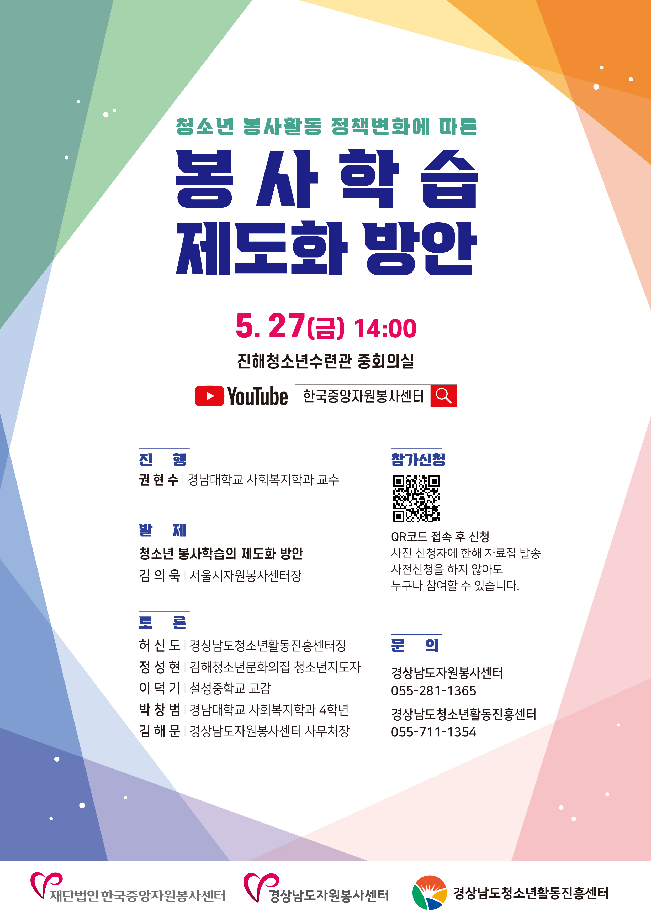 경상남도자원봉사센터는 청소년 봉사활동 정책변화에 따른 '봉사학습 제도화 방안'의 주제로 각 분야의 전문가와 함께 자원봉사 포럼을 개최하고자 합니다.  청소년 자원봉사 활성화에 관심있으신 분들의 많은 참여를 부탁드리며, 사전신청 하시는 분들께는 이메일로 자료집을 송부드리오니 참고해 주시면 감사하겠습니다.