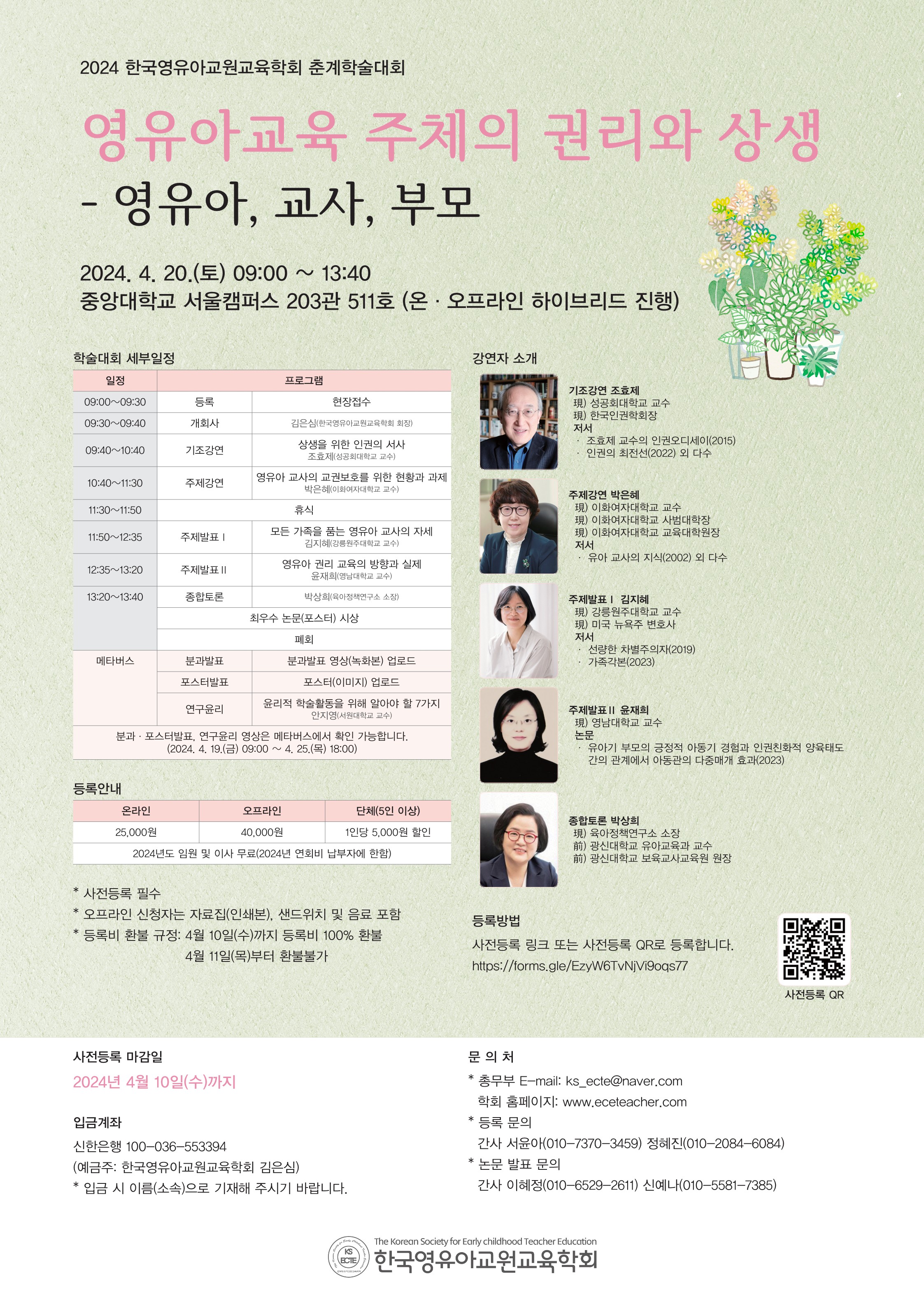 본 학회에서는 2024 4 20()에 영유아교육 주체의 권리와 상생-영유아, 교사, 부모를 주제로 춘계학술대회를 개최합니다.