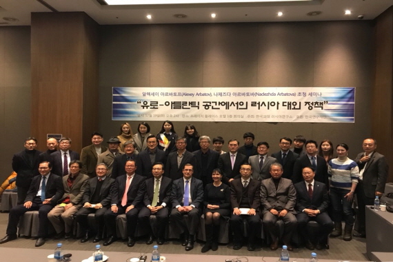 한국외대 러시아연구소는  12 월  19 일 오후  2 시부터 서울 프레이저 플레이스 호텔  1 층 회의실에서 러시아 저명 학자 겸 정치가인 알렉세이 아르바토프 박사 내외분을 모시고 세미나를 개최하였다 러시아 두마  3 선의원인 알렉세이 아르바토프 박사는 현재 세계경제 및 국제관계연구소 (IMEMO) 에 근무하고 있으며 국제관계에 능통한 러시아내 몇 안되는 전문가이다 그의 부인인 나제즈다 아르바토바 박사 역시  EU 관계에 정통한 러시아학자로 같은 연구소에서 근무하고 있다 아르바토프 박사는 한반도 긴장상태와 관련하여 미국의 현 트럼프정부의 예측불가능 상황에 대하여 우려를 표시하며 틸러슨이 제안한 북 · 미간 대화로 나가야 한다고 강조하였다 나제즈다 아르바토바 박사는 유럽연합과 러시아간의 관계 개선을 위하여 우크라이나 돈바스 지역에 유엔 평화유지군 주둔이 가장 적절한 해결책이라고 개인적 의견을 표시하였다 .