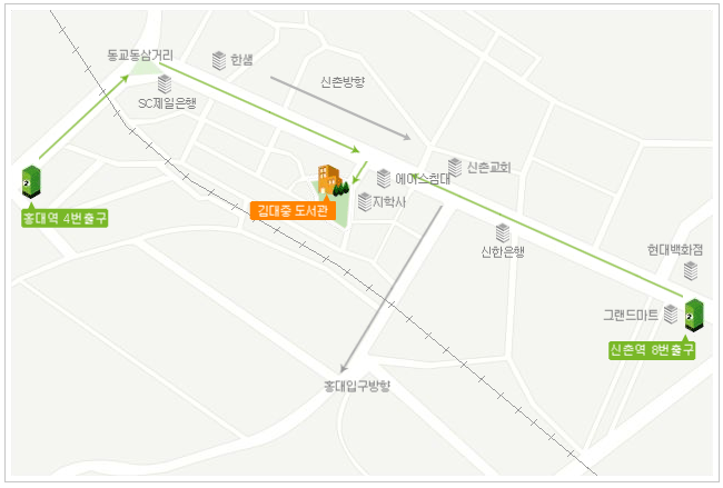 신촌로터리와 동교동로터리 중간 지점 <신촌장로교회> 맞은편 <에이스침대> 골목으로 들어오시면 바로 있습니다.