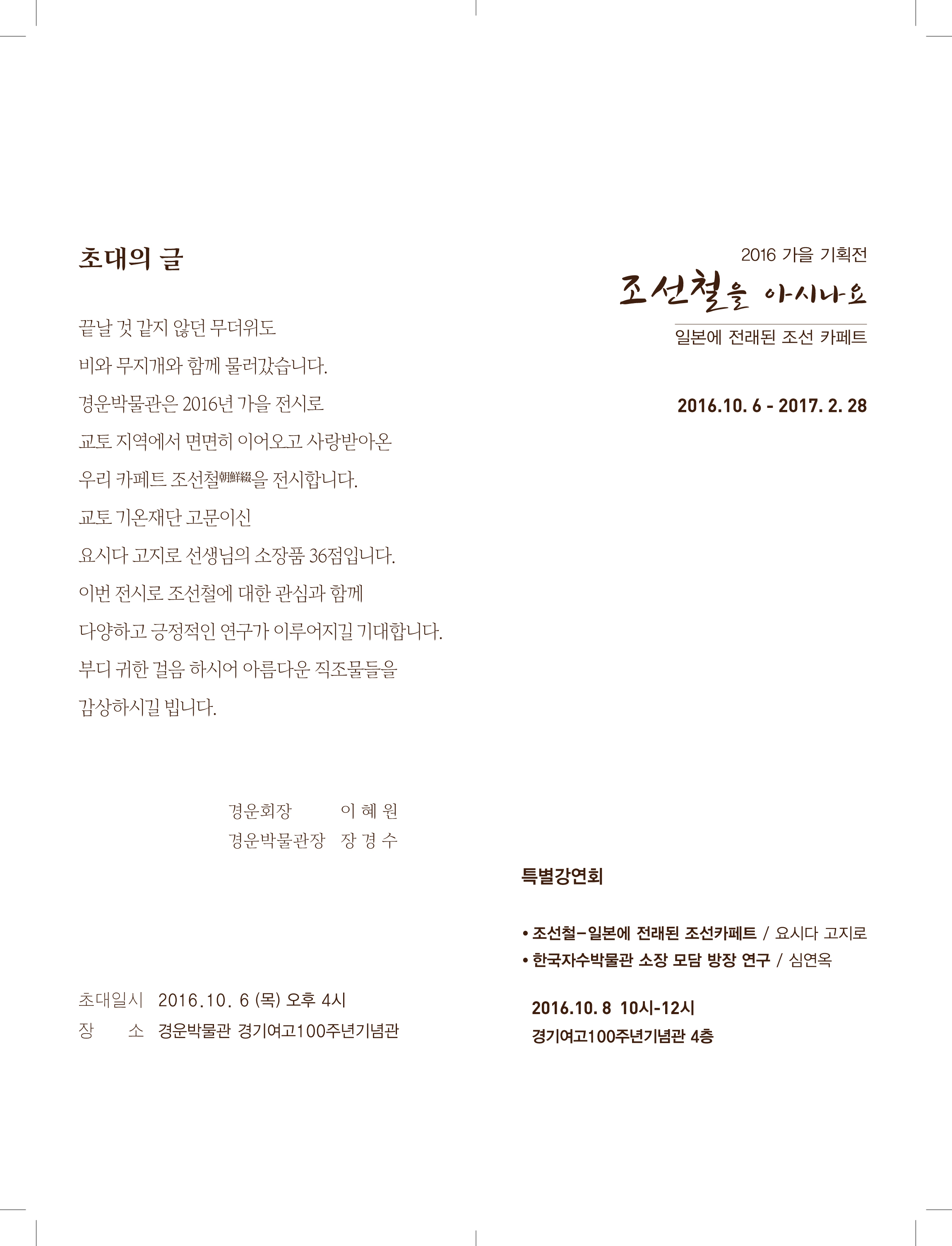10월 8일 오전 10시부터 12시까지 경기여고 100주년기념관 4층에서 ‘조선철’ 특별강연을 개최한다. 주제발표는 요시다고지로 선생의 ‘일본에 전래된 조선철, 조선 카페트’, 한국전통문화대학교 심연옥 교수의 ‘한국자수박물관 소장 모담 방장 연구’를 각각 발제할 예정이다.