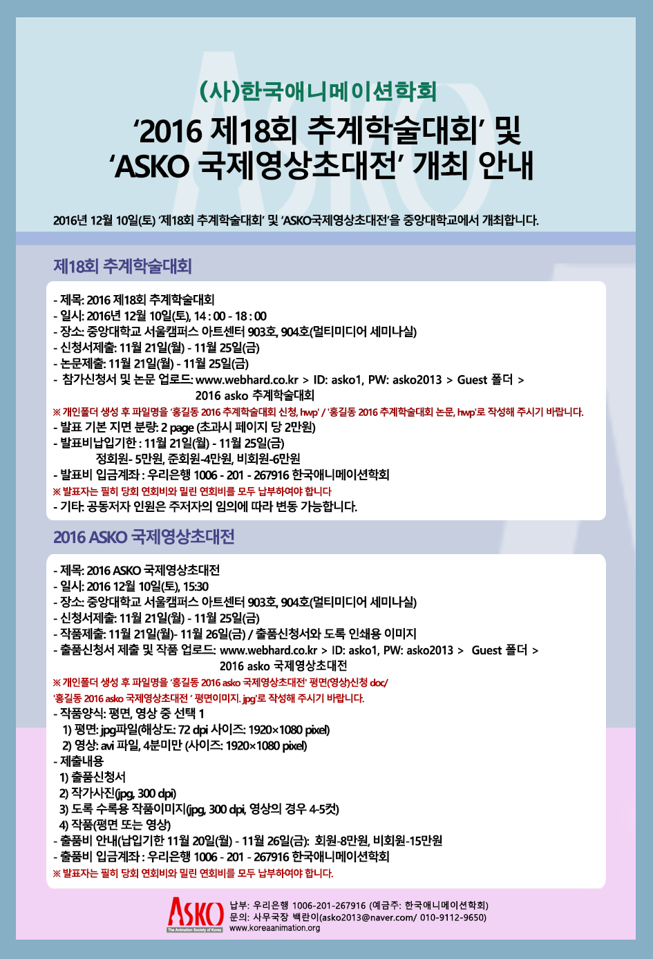 2016 제18회 추계학술대회 및 ASKO국제영상전 안내