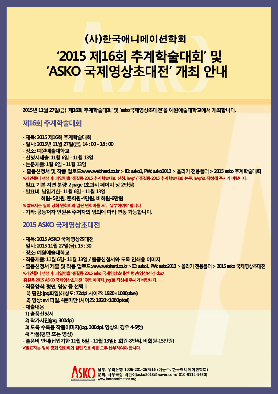 ]‘2015 제16회 추계학술대회’ 및 ‘ASKO 국제영상초대전' 개최 안내