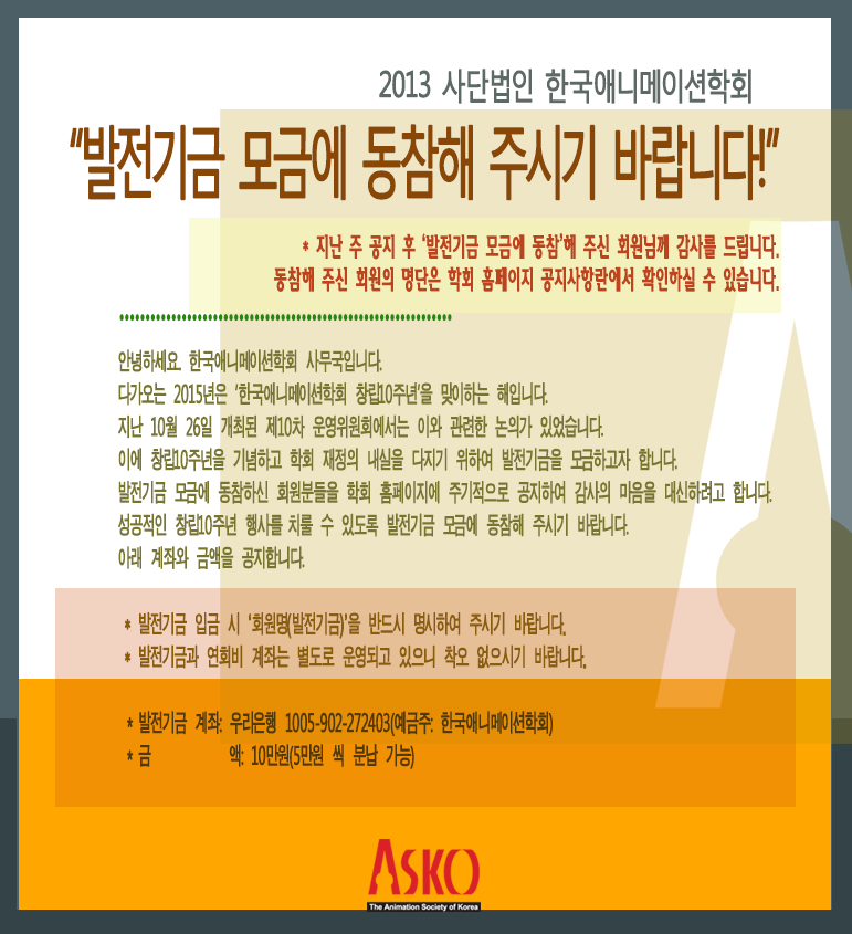 2005년 3월 창립된 본 학회의 창립10주년(2015년)을 기념하기 위해 발전기금을 모금하고 있습니다. 회원님들의 성원 부탁합니다.