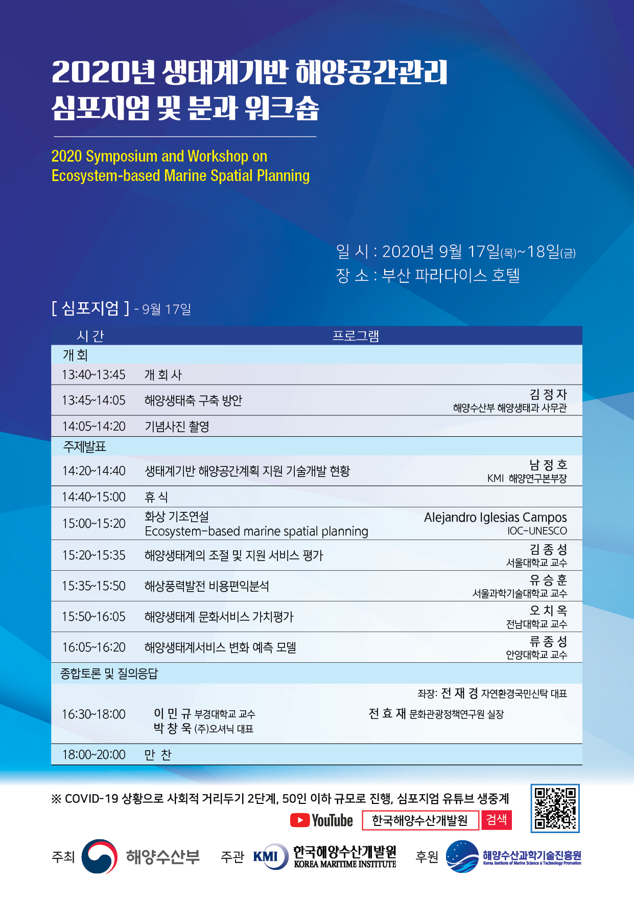 한국해양수산개발원(KMI) 해양공간연구센터에서는 '생태계 기반 해양공간관리 심포지엄'을 개최한다고 합니다.