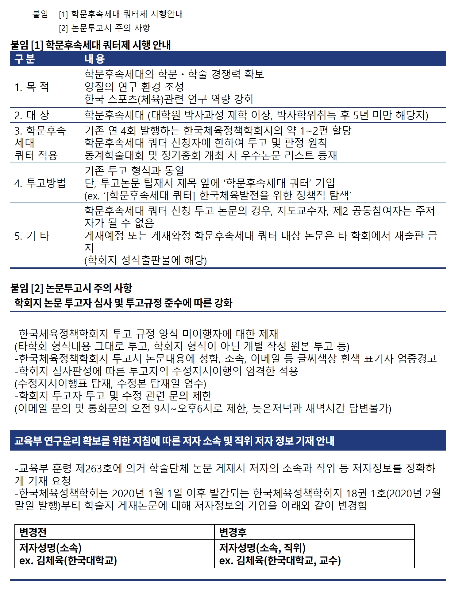 붙임 [1] 학문후속세대 쿼터제 시행 안내| 구 분 | 내 용 | | 1. 목 적 | 학문후속세대의 학문ㆍ학술 경쟁력 확보 양질의 연구 환경 조성 한국 스포츠(체육)관련 연구 역량 강화 | | 2. 대 상 | 학문후속세대 (대학원 박사과정 재학 이상, 박사학위취득 후 5년 미만 해당자) | 3. 학문후속세대 쿼터 적용 | 기존 연 4회 발행하는 한국체육정책학회지의 약 1~2편 할당 학문후속세대 쿼터 신청자에 한하여 투고 및 판정 원칙 동계학술대회 및 정기총회 개최 시 우수논문 리스트 등재 | | 4. 투고방법 | 기존 투고 형식과 동일 단, 투고논문 탑재시 제목 앞에 ‘학문후속세대 쿼터’ 기입 (ex. ‘[학문후속세대 쿼터] 한국체육발전을 위한 정책적 탐색’ | | 5. 기 타 | 학문후속세대 쿼터 신청 투고 논문의 경우, 지도교수자, 제2 공동참여자는 주저자가 될 수 없음 게재예정 또는 게재확정 학문후속세대 쿼터 대상 논문은 타 학회에서 재출판 금지 (학회지 정식출판물에 해당) | 붙임 [2] 논문투고시 주의 사항 | 학회지 논문 투고자 심사 및 투고규정 준수에 따른 강화 | -한국체육정책학회지 투고 규정 양식 미이행자에 대한 제재 (타학회 형식내용 그대로 투고, 학회지 형식이 아닌 개별 작성 원본 투고 등) -한국체육정책학회지 투고시 논문내용에 성함, 소속, 이메일 등 글씨색상 흰색 표기자 엄중경고 -학회지 심사판정에 따른 투고자의 수정지시이행의 엄격한 적용 (수정지시이행표 탑재, 수정본 탑재일 엄수) -학회지 투고자 투고 및 수정 관련 문의 제한 (이메일 문의 및 통화문의 오전 9시~오후6시로 제한, 늦은저녁과 새벽시간 답변불가) | | 교육부 연구윤리 확보를 위한 지침에 따른 저자 소속 및 직위 저자 정보 기재 안내 | -교육부 훈령 제263호에 의거 학술단체 논문 게재시 저자의 소속과 직위 등 저자정보를 정확하게 기재 요청 -한국체육정책학회는 2020년 1월 1일 이후 발간되는 한국체육정책학회지 18권 1호(2020년 2월 말일 발행)부터 학술지 게재논문에 대해 저자정보의 기입을 아래와 같이 변경함 | 변경전 | 변경후 | 저자성명(소속) ex. 김체육(한국대학교) | 저자성명(소속, 직위) ex. 김체육(한국대학교, 교수) |