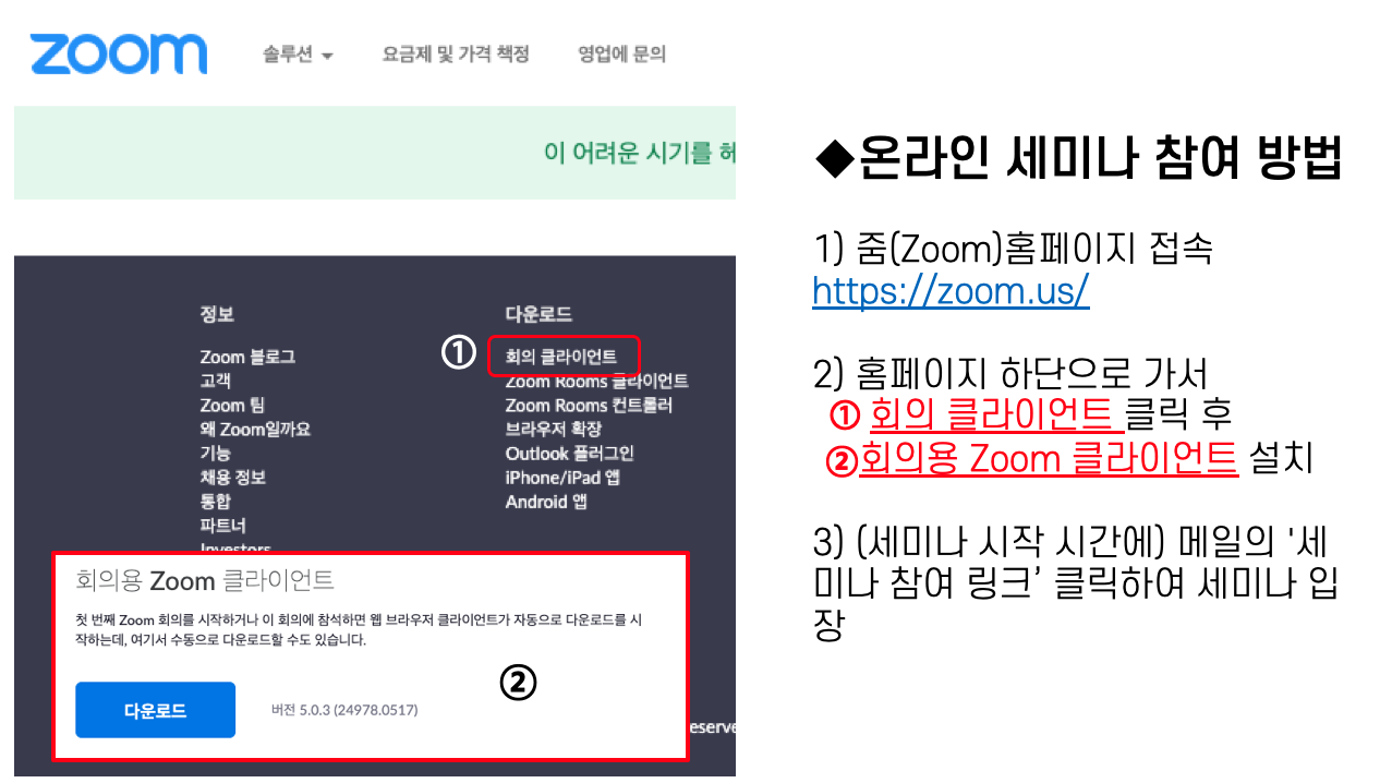 2) 컴퓨터의 경우 줌 프로그램(휴대전화의 경우 줌 어플)을 설치 후 아래의 세미나 참여 링크를 클릭하여 주시면 온라인 세미나실로 연결됩니다.