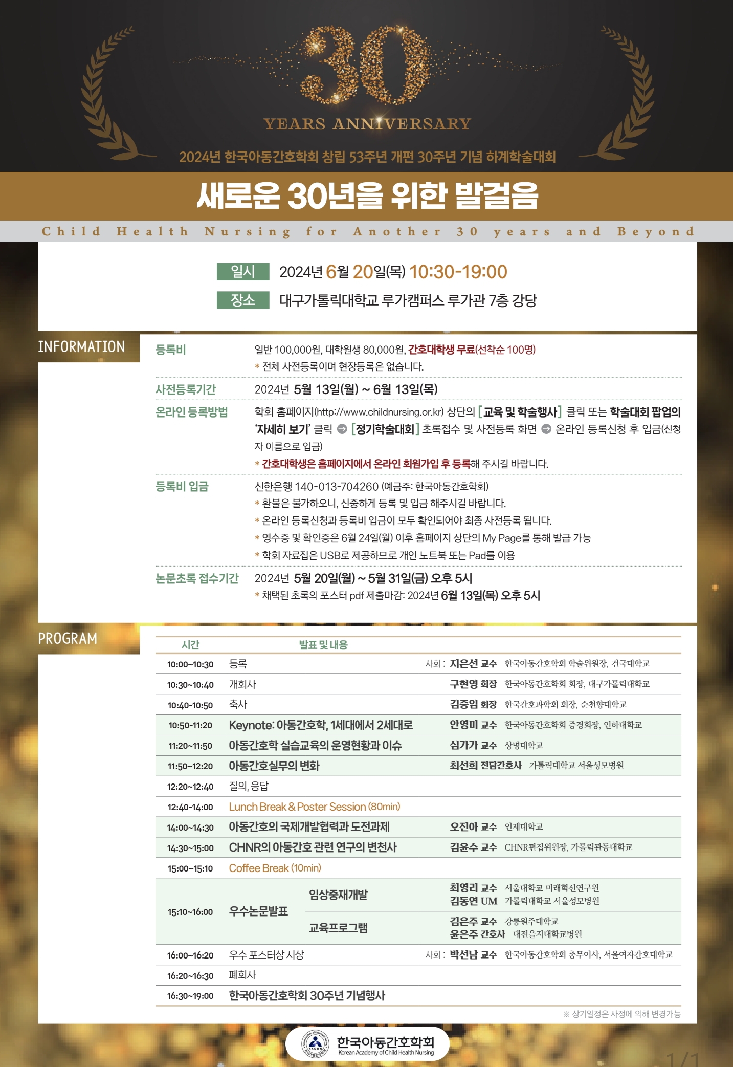 - 주제: 새로운 30년을 위한 발걸음- Child Health Nursing for Another 30 years and Beyond·