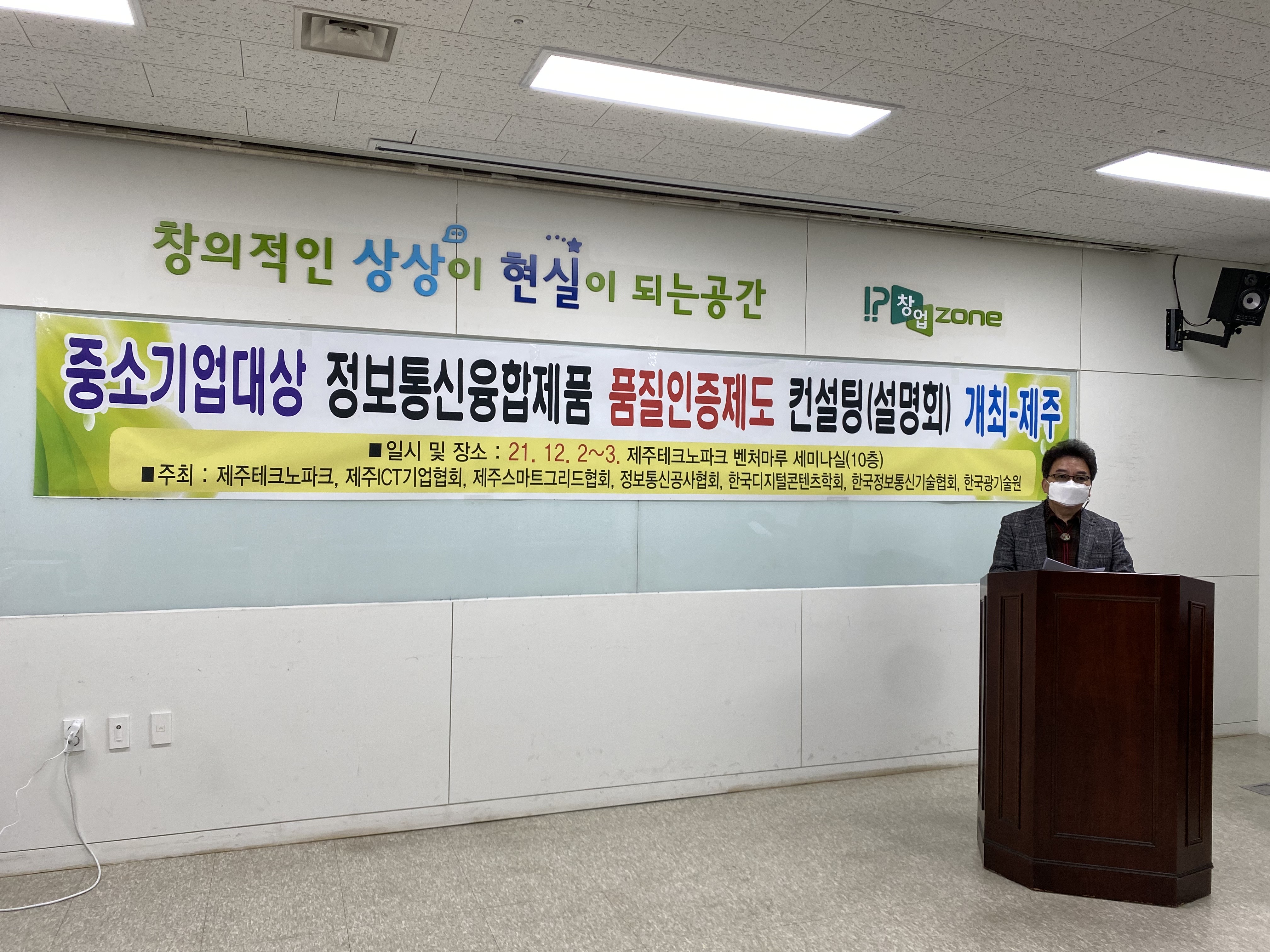 2021 중소기업대상 정보통신융합제품 품질인증제도 설명회·컨설팅 및 워크샵이 제주 테크노파크 벤처마루에서 방역지침 준수하에 개최되었습니다.
