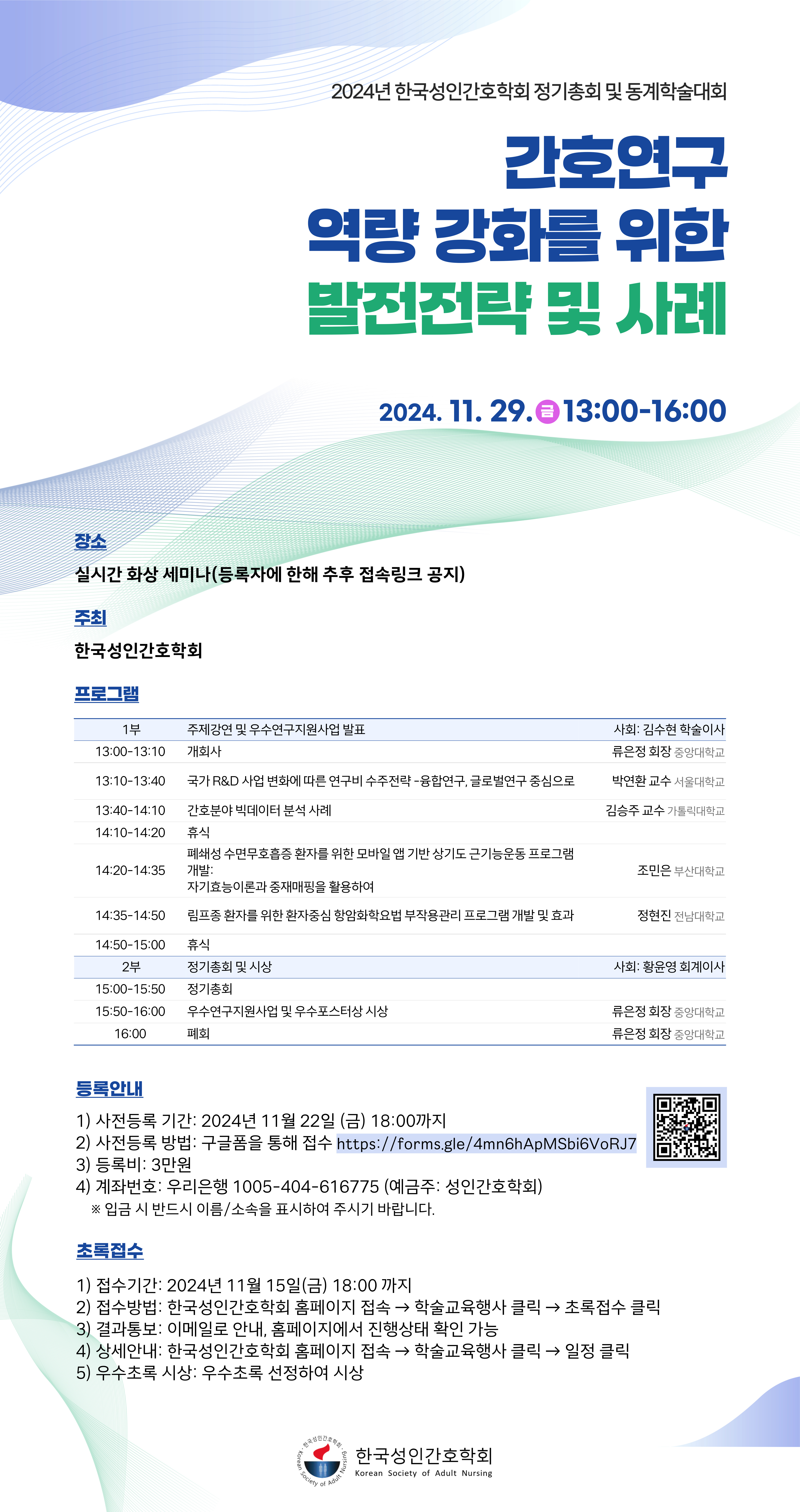 한국성인간호학회에서 2024년 동계학술대회를 개최합니다.
