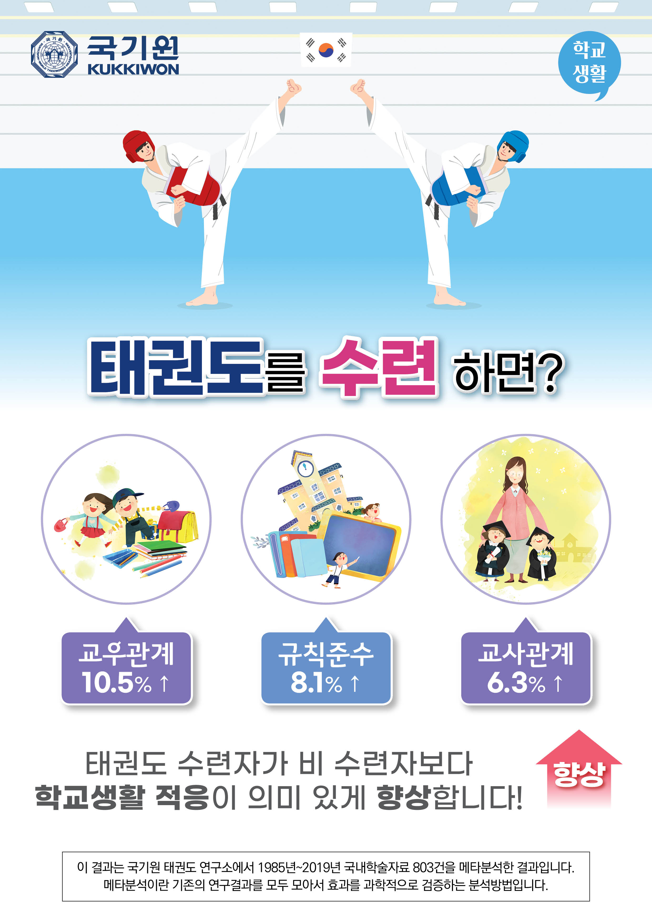 태권도를 수련하면 학교생활 적응이 개선된다는 연구결과입니다.