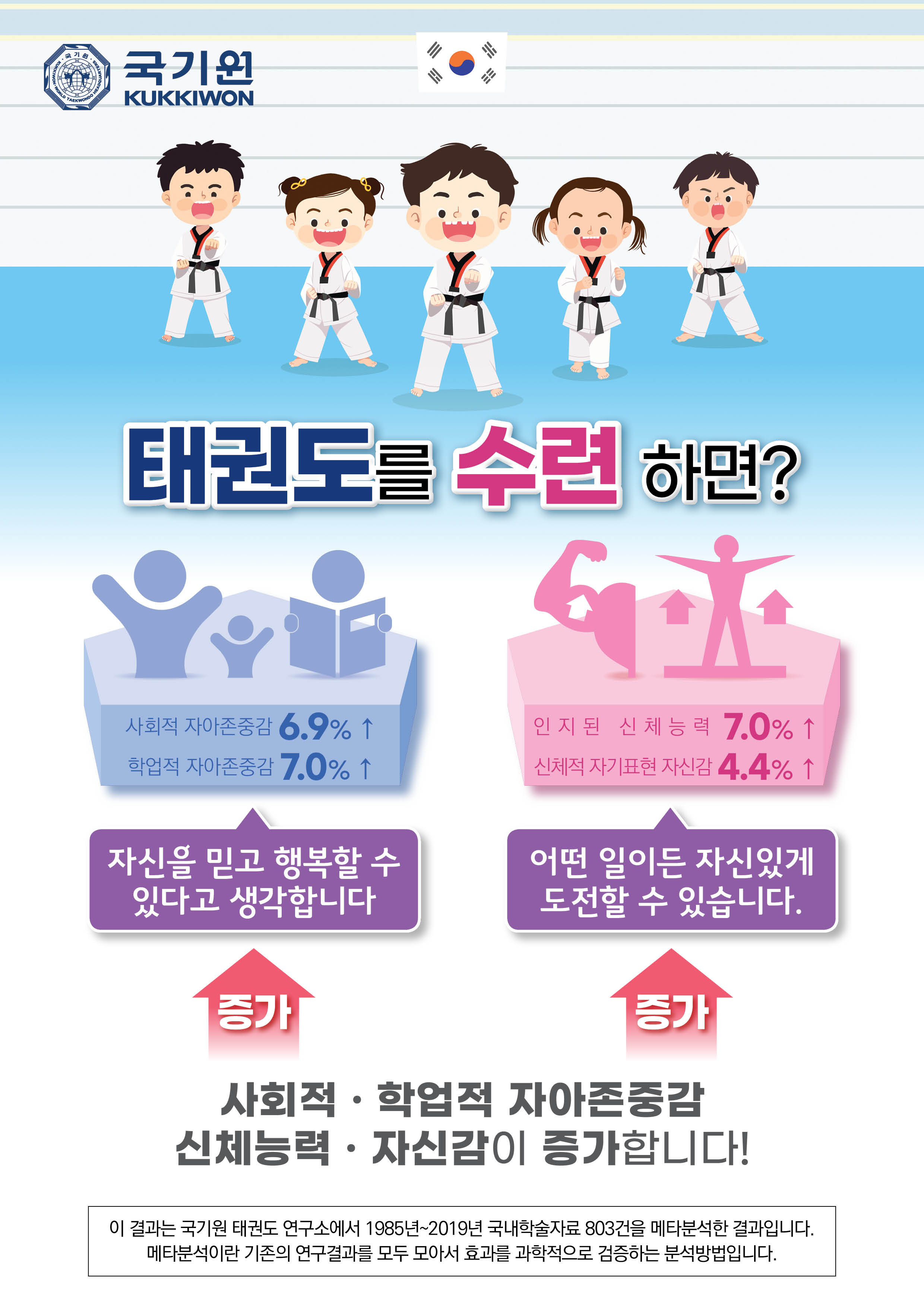 태권도를 수련하면 자신에 대한 존중감과 자신감이 더 증가한다는 연구결과입니다.