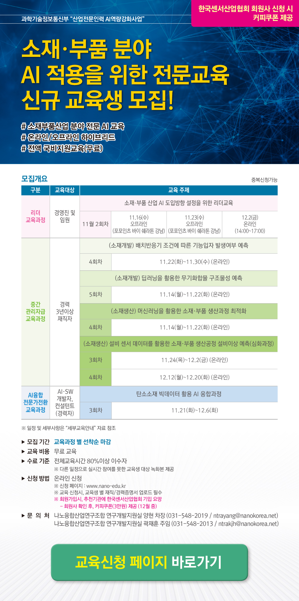 [나노융합산업연구조합] 소재/부품분야 AI적용을 위한 전문교육 신규 교육생 모집