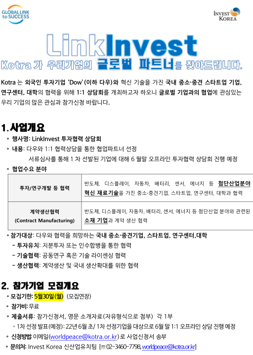 이 사업은 KOTRA창립 60주년 기념 사업으로 외국인투자기업과 국내기업의 협력 활성화를 지원하기위해 기획되었으며 교수, 연구진 그리고 기업들에게 도움이 될 수 있는 소식이라 생각합니다.