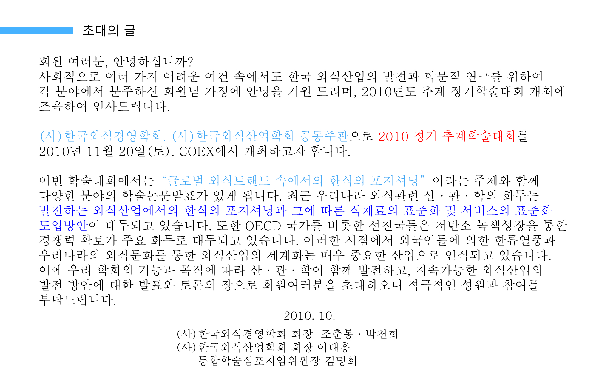 분주하신 회원님 가정에 안녕을 기원 드리며, 2010년도 추계 정기학술대회 개최에 즈음하여 인사드립니다.