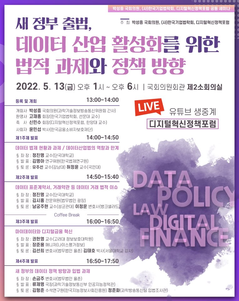 ※ 이번 학술대회는 오프라인과 온라인 송출(유튜브 생중계-디지털혁신정책포럼방식으로 진행될 예정입니다오프라인 참여를 희망하시는 회원들께서는 학회 메일(kbla@bla.re.kr) 5/10()까지 참여의사를 알려주시길 부탁드립니다명단이 등록이 되어 있지 않을 경우당일에 번거로운 절차를 밟아야 할 수 있습니다그리고 국회 출입을 위하여 당일 신분증을 반드시 소지해 주시길 부탁드립니다.