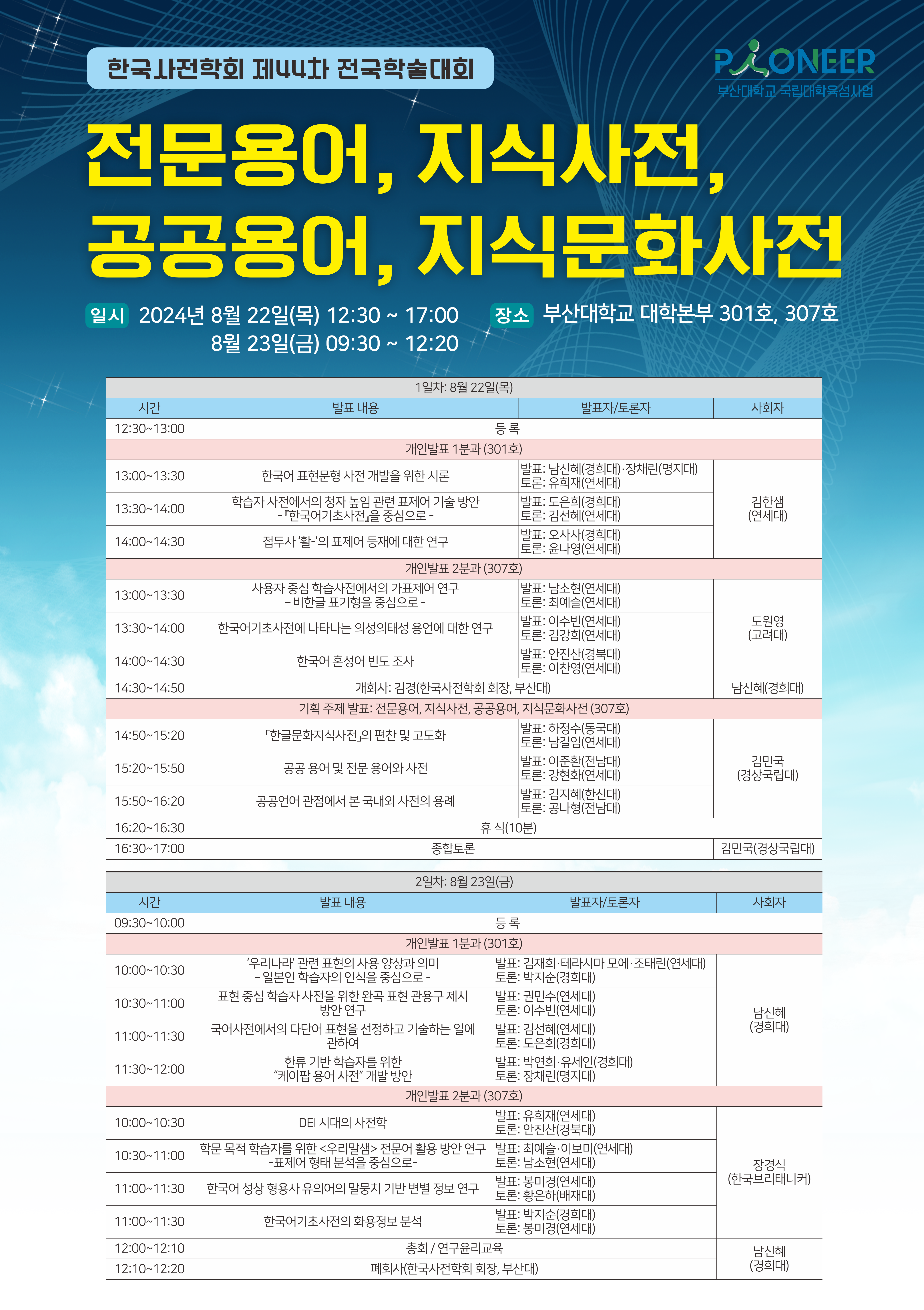 한국사전학회 제44차 전국학술대회가 오는 8월 22일 목요일 12시 30분부터 금요일 12:20분까지 부산대학교에서 열립니다.