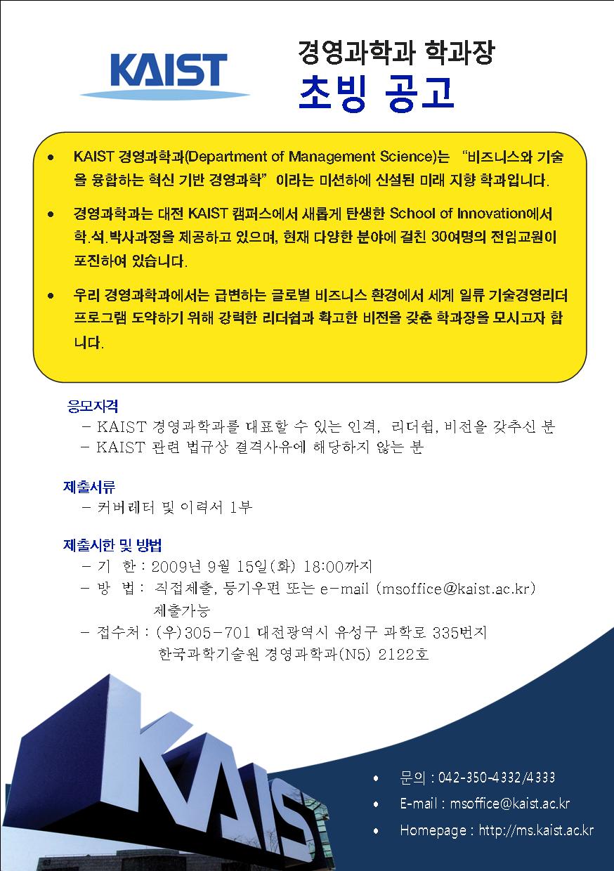 KAIST 경영과학과 학과장 초빙 공고문을 참조하시어 관심있는 분들의