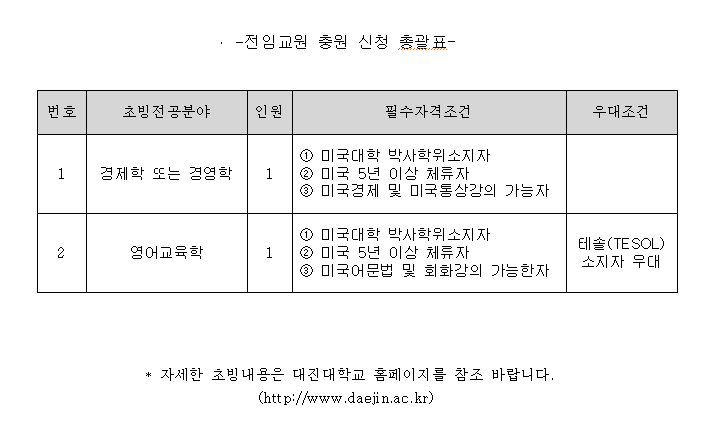2010학년도 1학기 대진대학교 미국학과 신규 전임교원 충원