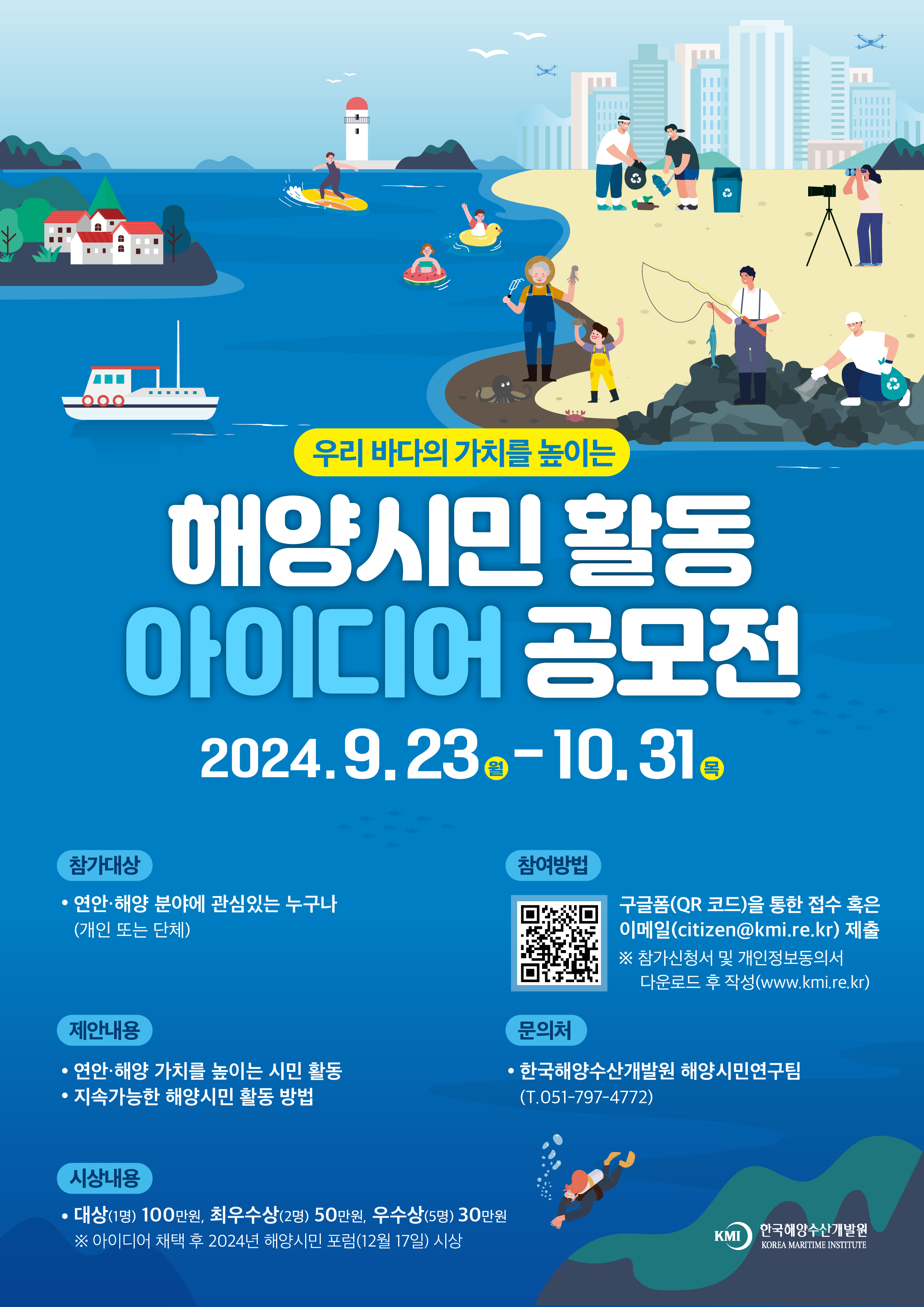 한국해양수산개발원에서는 우리 바다의 가치를 높이는 해양시민 활동 아이디어를 공모 중입니다. 아래와 같이 관련 사항을 안내하오니 많은 관심과 참여 부탁드립니다.