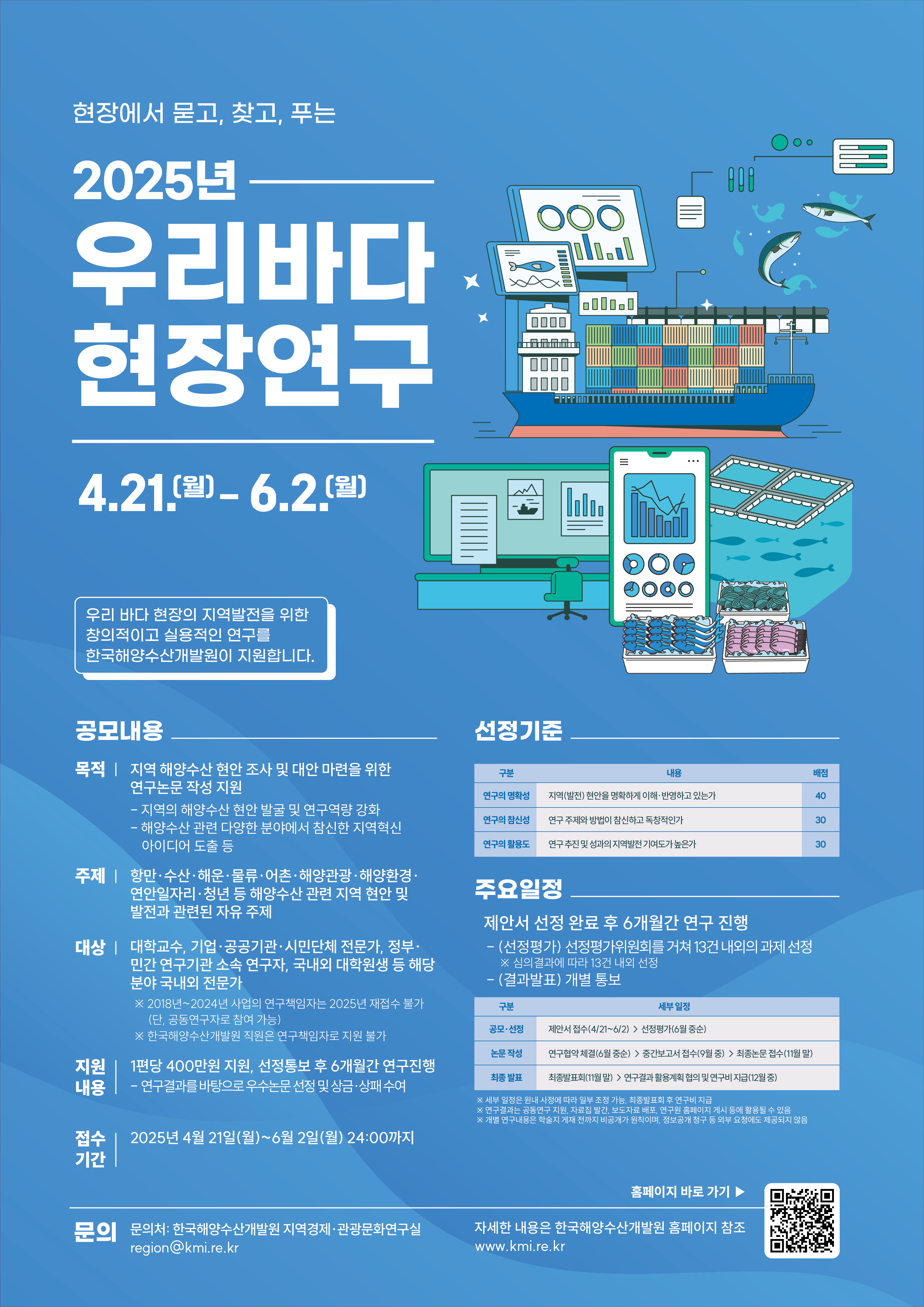 [외부] 한국해양수산개발원 2025년 우리바다 현장연구 지원사업 공모 안내(~6/2(월))