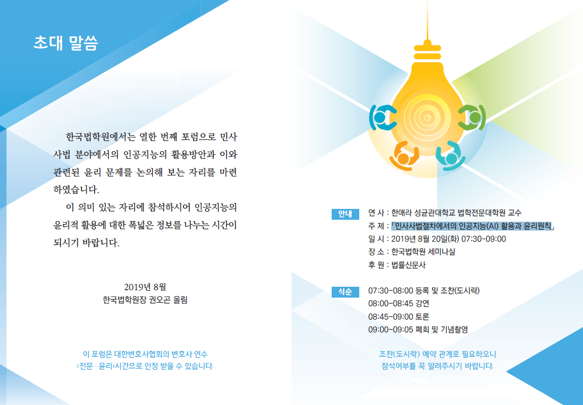 성균관대학교 법학전문대학원의 한애라 교수님을 모시고 <민사사법절차에서 인공지능(AI)의 활용과 윤리원칙>이라는 주제로 제11회 한국법학원 포럼을 개최합니다.