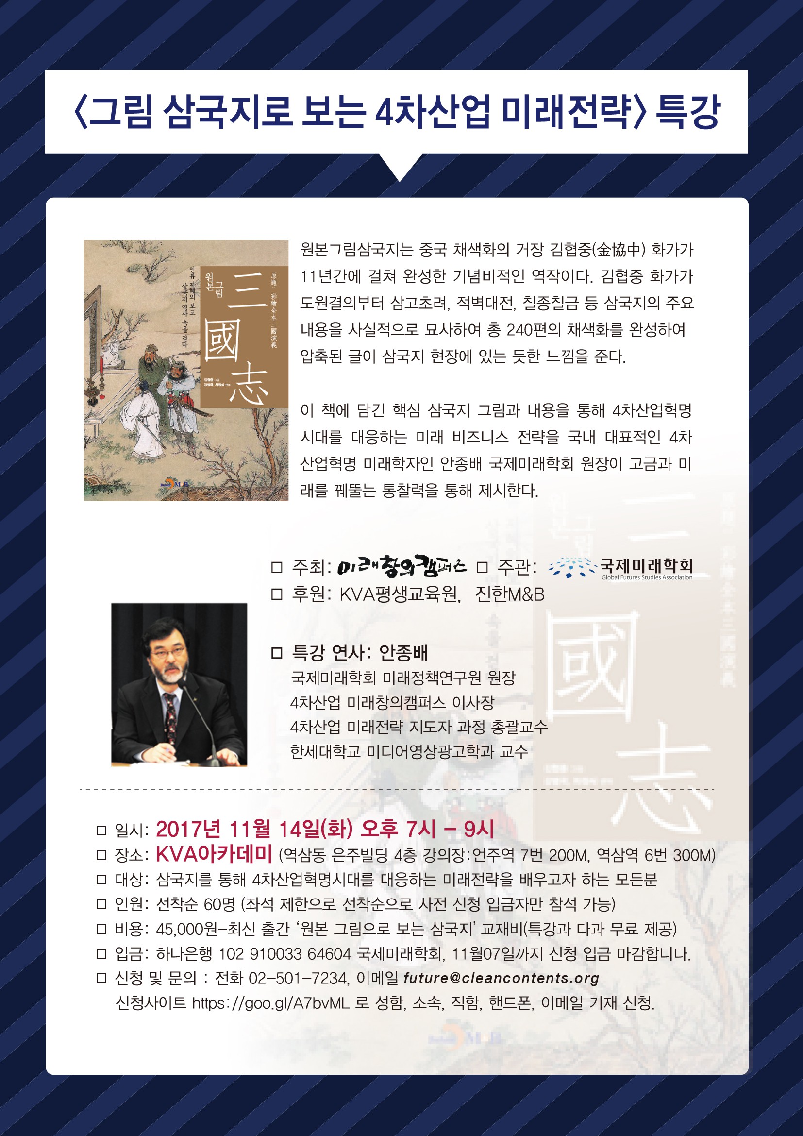 미래창의캠퍼스와 국제미래학회가 주최하고 KVA평생교육원, 진한M&B가 후원하는 이 번 특별 강연은 오는 11월 14일(화) 오후 7시 ? 9시 KVA아카데미 (역삼동 은주빌딩 4층)에서 열린다. 최고의 전략서인 삼국지를 4차산업혁명 미래전략으로 재해석하기는 이번이 처음으로 알려지면서 이 분야 학자와 관심 있는 분들이 큰 호응을 나타내고 있다.