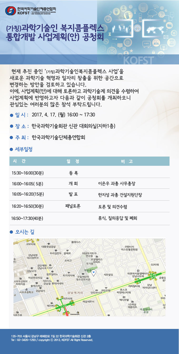 [과총] (가칭)과학기술인 복지콤플렉스 통합개발 사업계획 공청회 개최 안내