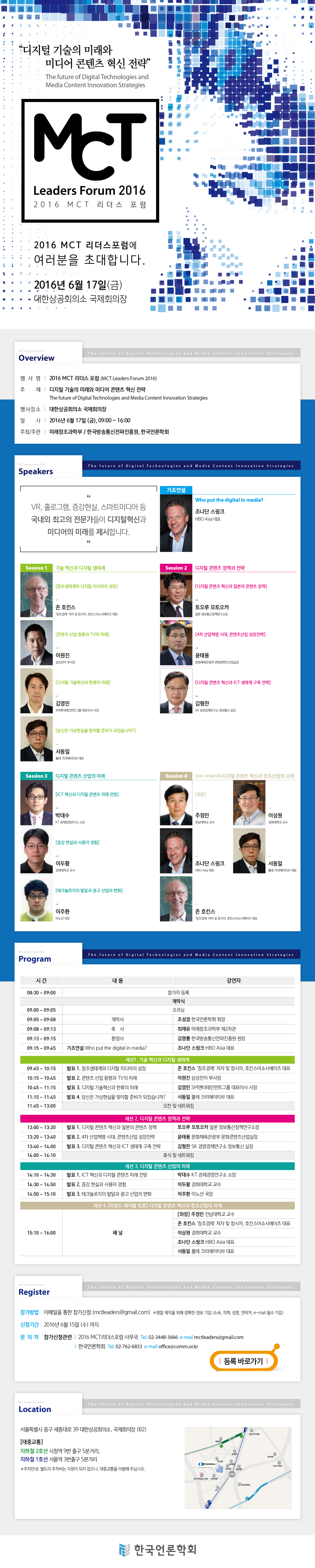 안녕하세요. 한국디지털콘텐츠학회 사무국입니다. 아래와 같이 '2016 MCT 리더스 포럼 (MCT Leaders Forum 2016)'을 개최하오니 관심있는 분들의 참여 바랍니다. ----------------------------------------------------------------- 안녕하십니까, 한국언론학회 / 2016 MCT 리더스포럼 운영사무국입니다. 오는 6월 17일(금), 대한상공회의소 국제회의장에서 2016 MCT리더스포럼을 개최합니다. 본 행사는 미디어/디지털 콘텐츠 분야 관련하여 국내외 전문가들을 모시고, 글로벌 동향, 미래전략 및 정책 방향들을 모색하며, 신규 비즈니스 모델을 발굴하는 자리이며, 행사 개요는 아래와 같습니다. l 행사명: 2016 MCT 리더스 포럼 (MCT Leaders Forum 2016) l 일시/장소: 6월 17일(금), 09:00 ? 16:00 / 대한상공회의소 국제회의장 l 주최/주관: 미래창조과학부 / 한국방송통신전파진흥원, 한국언론학회 l 후원: 삼성전자 CJ E&M, SK텔레콤, KBS, KT 등 l 주제: 디지털 기술의 미래와 미디어 콘텐츠 혁신 전략 l 등록비: 대학생에 한해 무료 진행 l 등록방법: 이메일접수 mctleaders@gmail.com l 담당자 : 유영한 Direct: 82-(0)70-4912-7898 행사 프로그램 및 개요 등 포함한 뉴스레터 함께 첨부 드립니다. 상기 이미지 활용하여 홈페이지 내 게시판 혹은 유관 동아리 사이트에 등록하여 온라인홍보 부탁드립니다. 특히, 대학생분들은 무료 등록으로 많은 분들과 좋은 기회 함께하고자 하오니 참고 부탁드리겠습니다. 감사합니다.
