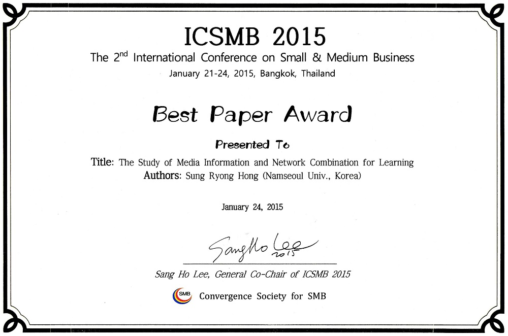논문편집위원장 홍성룡교수님(남서울대학교)께서 2015년 1월 태국 국제학술대회에서 우수 논문상을 시상하셨습니다.