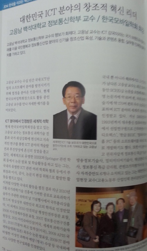 백석대학교 고응남교수(부회장) KOREA잡지 2014년 10월호 "ICT융합기술 시대"소개