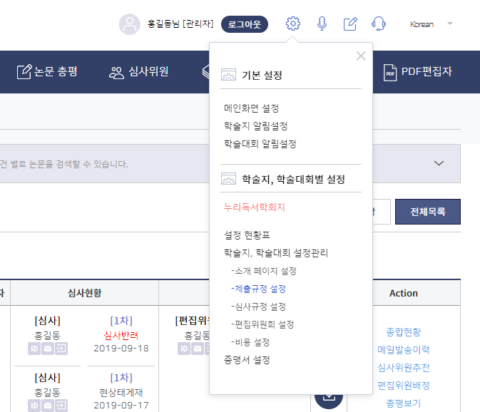 상단메뉴에서 다른 역할을 클릭하면, 다른 역할의 논문관리 페이지로 자동 연결 됩니다.