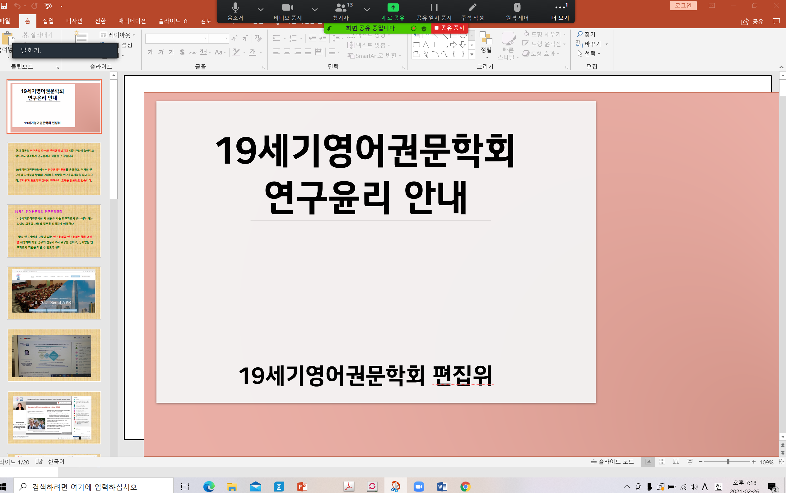 이전에 공지한 바와 같이 2021년 2월 26일, 임원회의 후에 19세기영어권문학회의 2021년 제1차 윤리교육을 실시하였습니다.