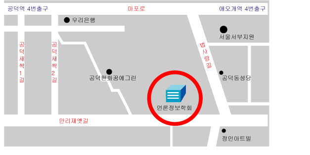 1. 회원 여러분의 건승을 기원합니다. 2. 한국언론정보학회는 다음과 같이 사무실을 이전하였음을 알려드리오니, 회원 여러분의 많은 관심을 부탁드립니다. 감사합니다.◀ 다 음 ▶1) 주소: 서울시 마포구 공덕동 120-10 백광빌딩 3층 302호2) 위치: 공덕역 4번 출구 도보 5분 거리, 애오개역 4번 출구 7분 거리 (첨부 파일 참조)3) 문의: 사무국(02-392-4426)한국언론정보학회장