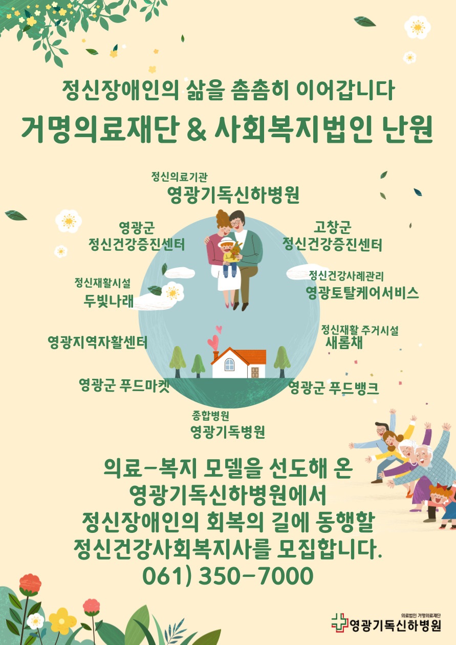 영광기독신하병원은 보건복지부 지정 인증의료기관 및 정신건강전문요원 수련기관으로 정신건강의학과 환자들의 치료와 회복에 힘쓰고 있습니다. 보다 나은 치료 및 재활서비스를 제공하고자 정신건강사회복지사를 모집 하오니 많은 지원 바랍니다.