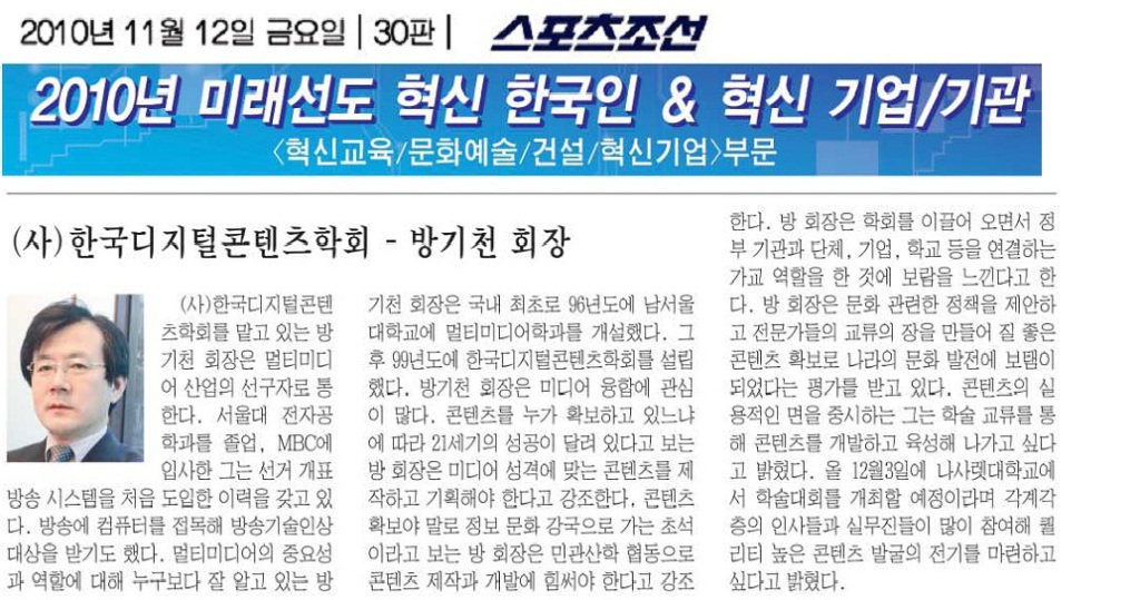 스포츠조선 2010년 미래선도 혁신 한국인에 선정되셨습니다.