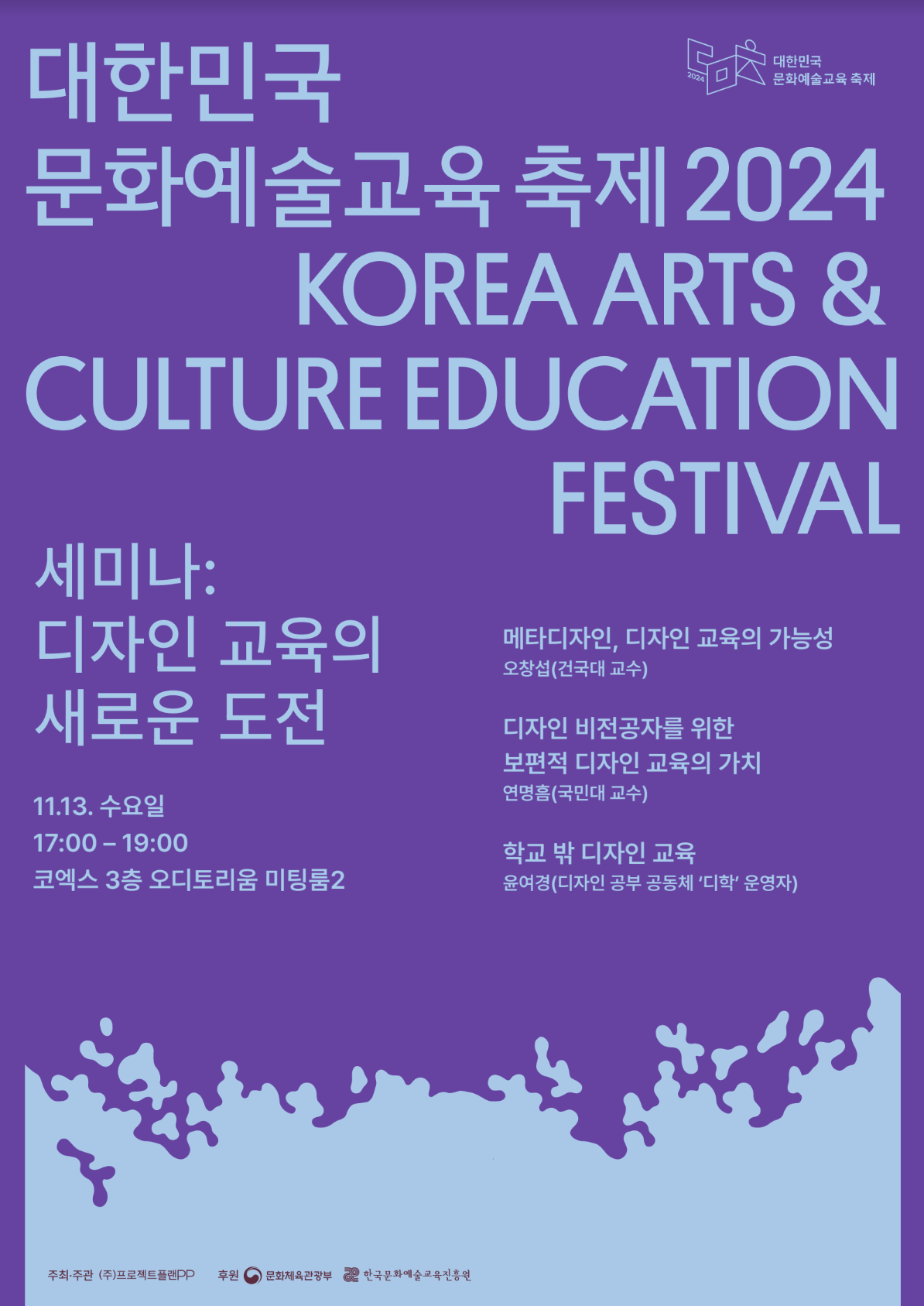 11월 13일(수) 코엑스 3층 오디토리움 미팅룸3에서 <문화예술교육 포럼 - 디자인 교육의 새로운 도전>이 개최됩니다.