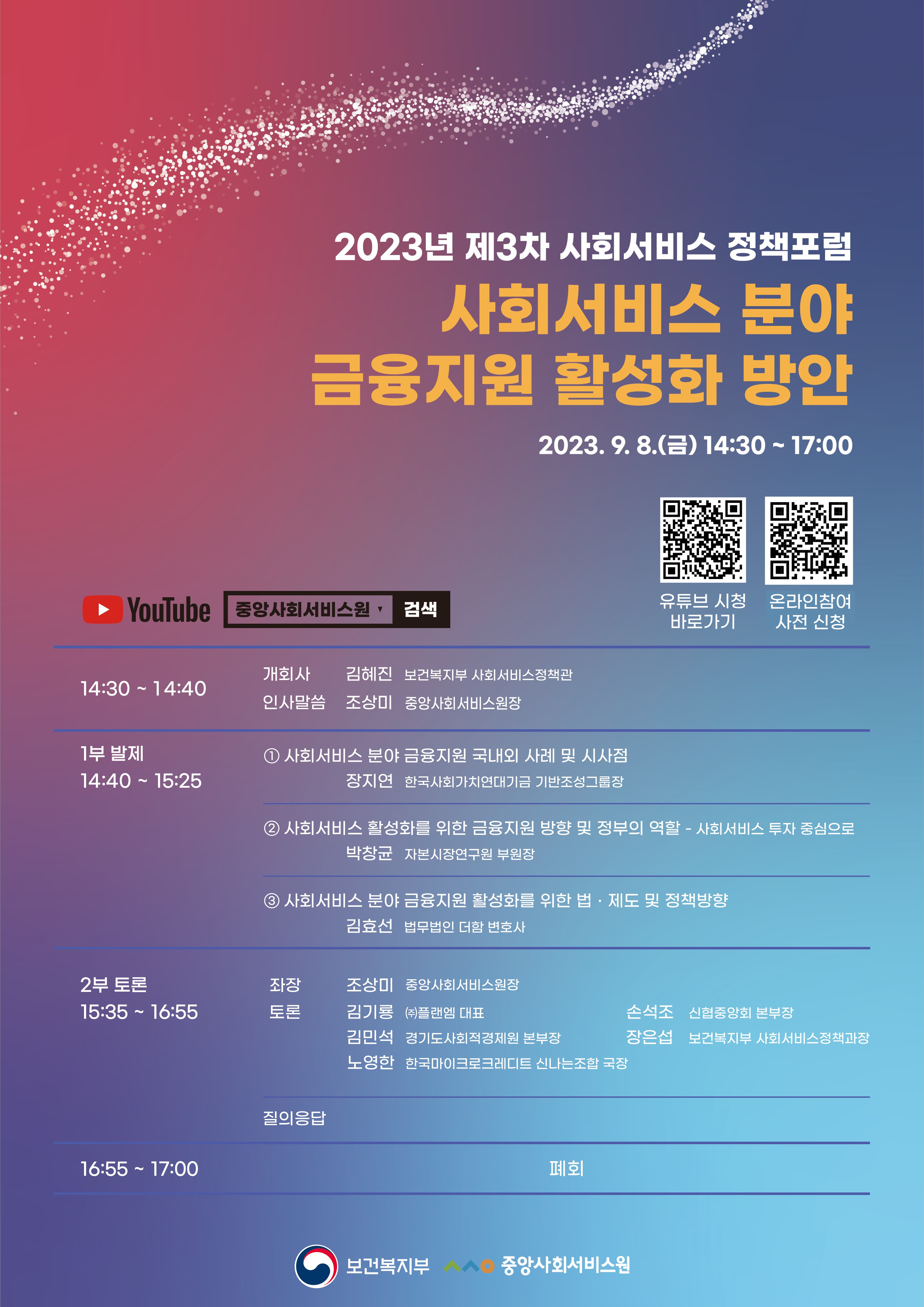 이번 포럼은 2023. 9. 8.(금) 14:30~17:00 까지 개최되며, 중앙사회서비스원 유튜브 계정으로 실시간 송출됩니다.
