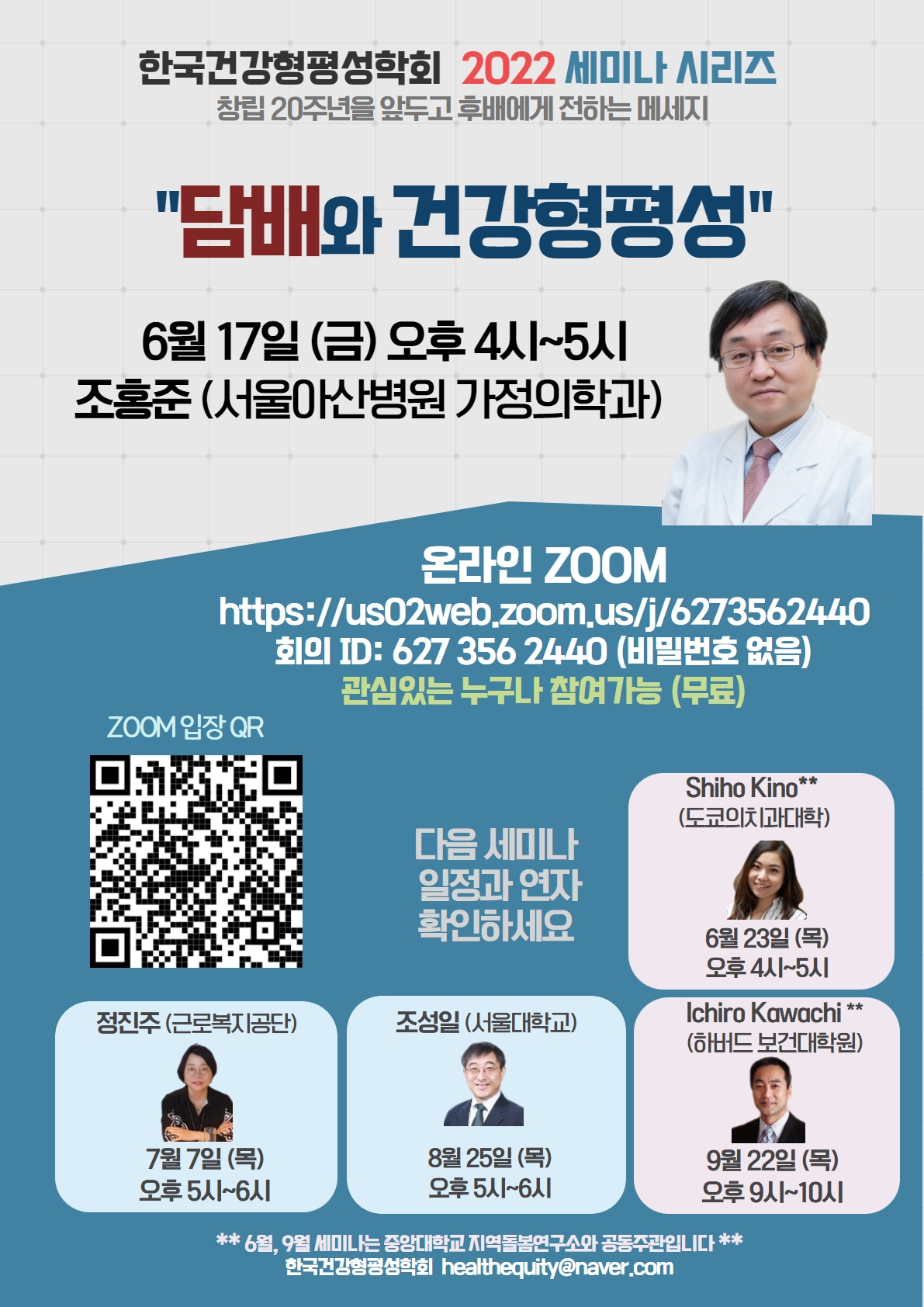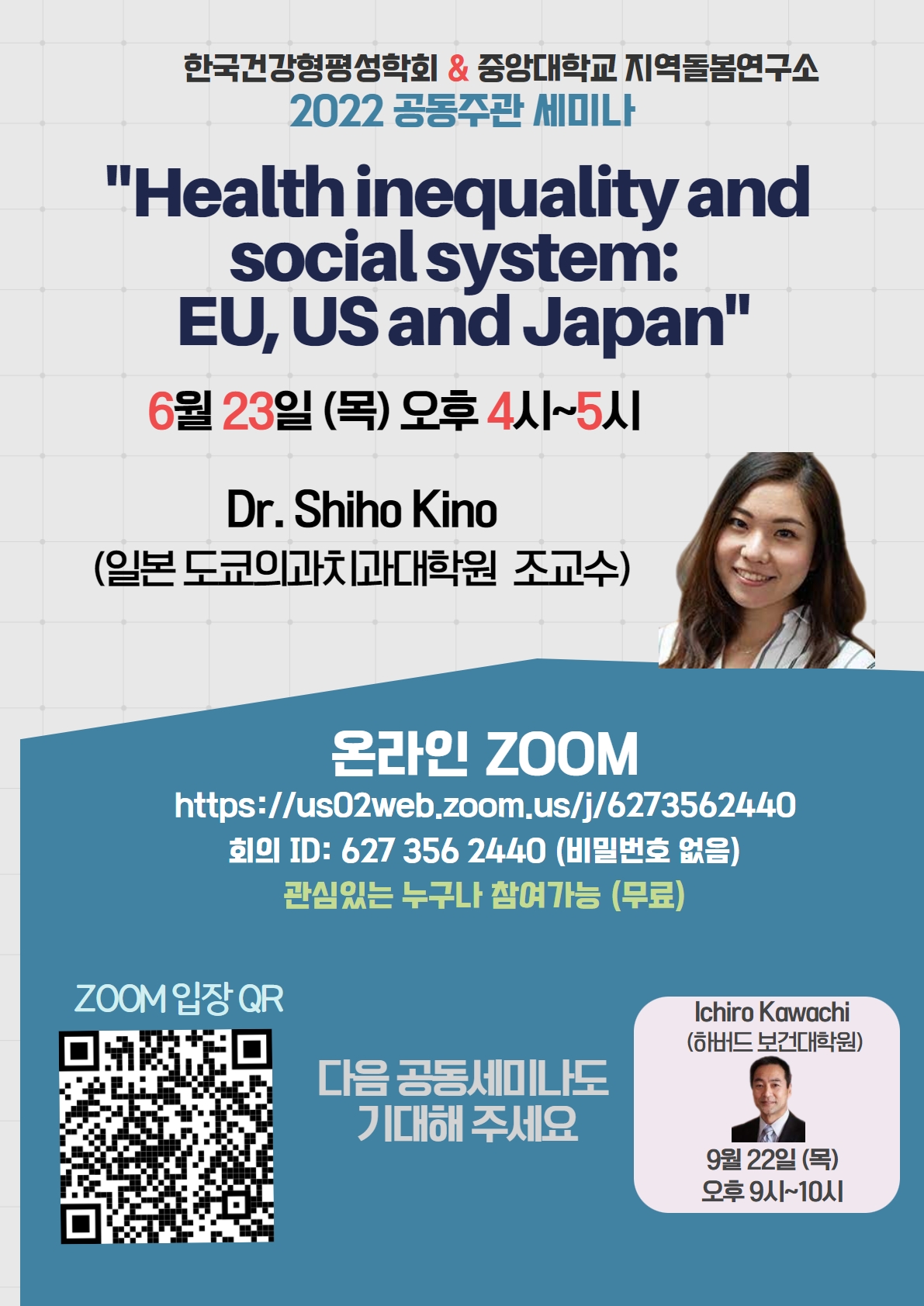 6월 23일에는 'Health inequality and social system: EU, US and Japan'를 주제로 세미나를 진행합니다.