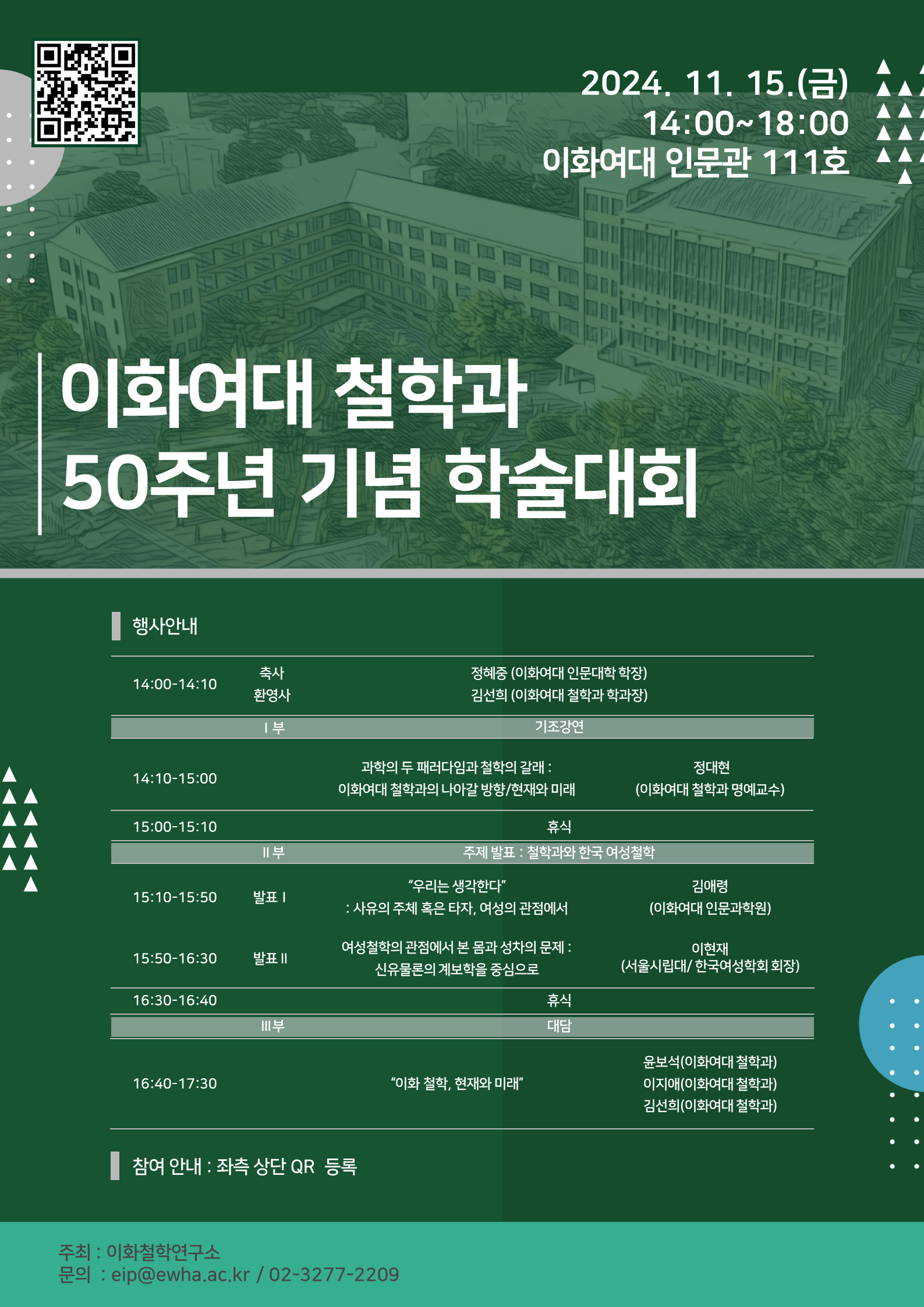 [이화여자대학교 철학연구소]에서 이화여대 철학과 설립 50주년을 기념하여 학술대회를 개최합니다.