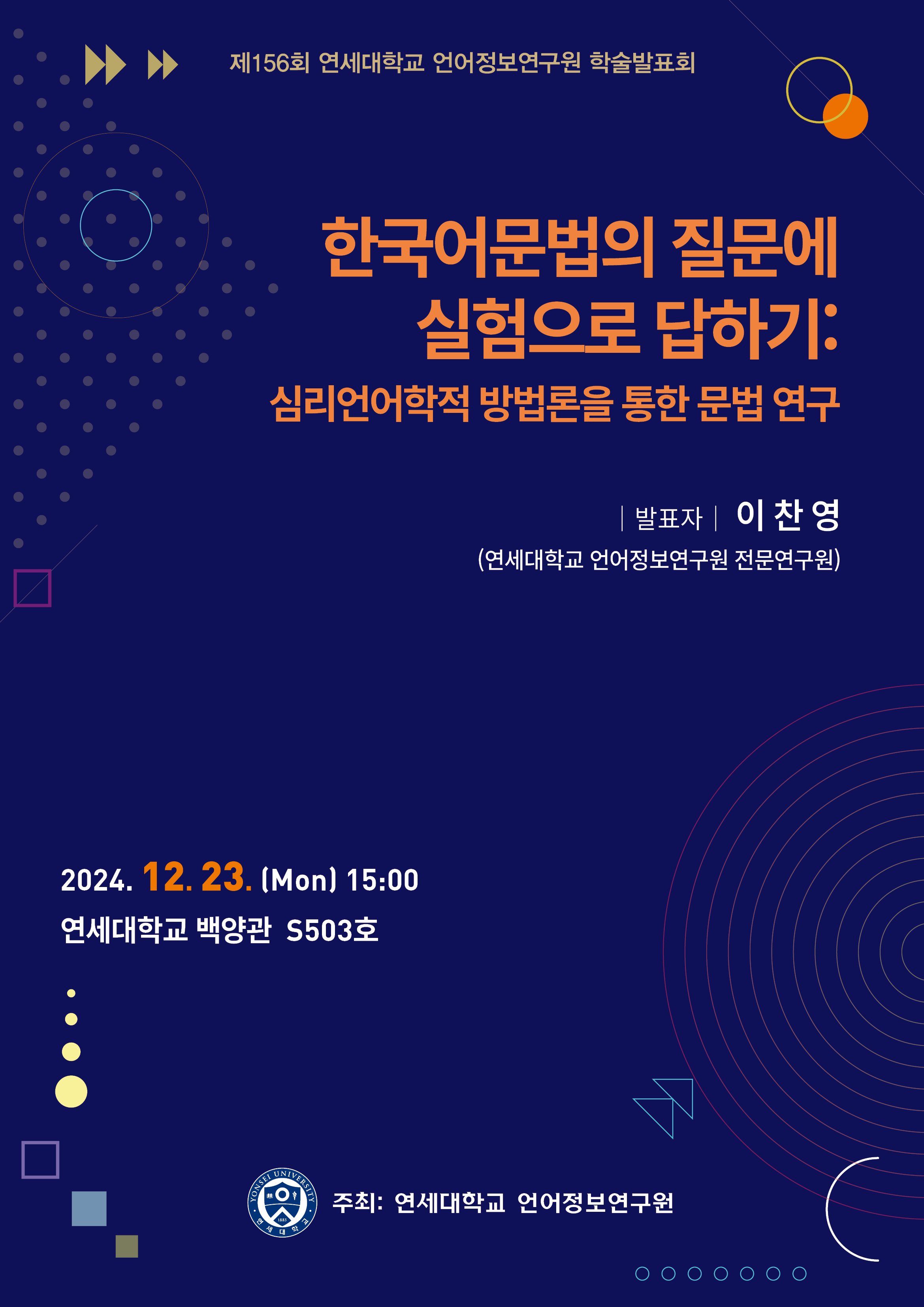 우리 연구원에서는 12월 23일(월요일) 오후 3시 연세대학교 언어정보연구원 전문연구원이신 이찬영 선생님을 모시고 "문법의 질문에 실험으로 답하기: 심리언어학적 방법론을 통한 문법 연구"라는 주제로 제156회 학술발표회를 개최합니다.
