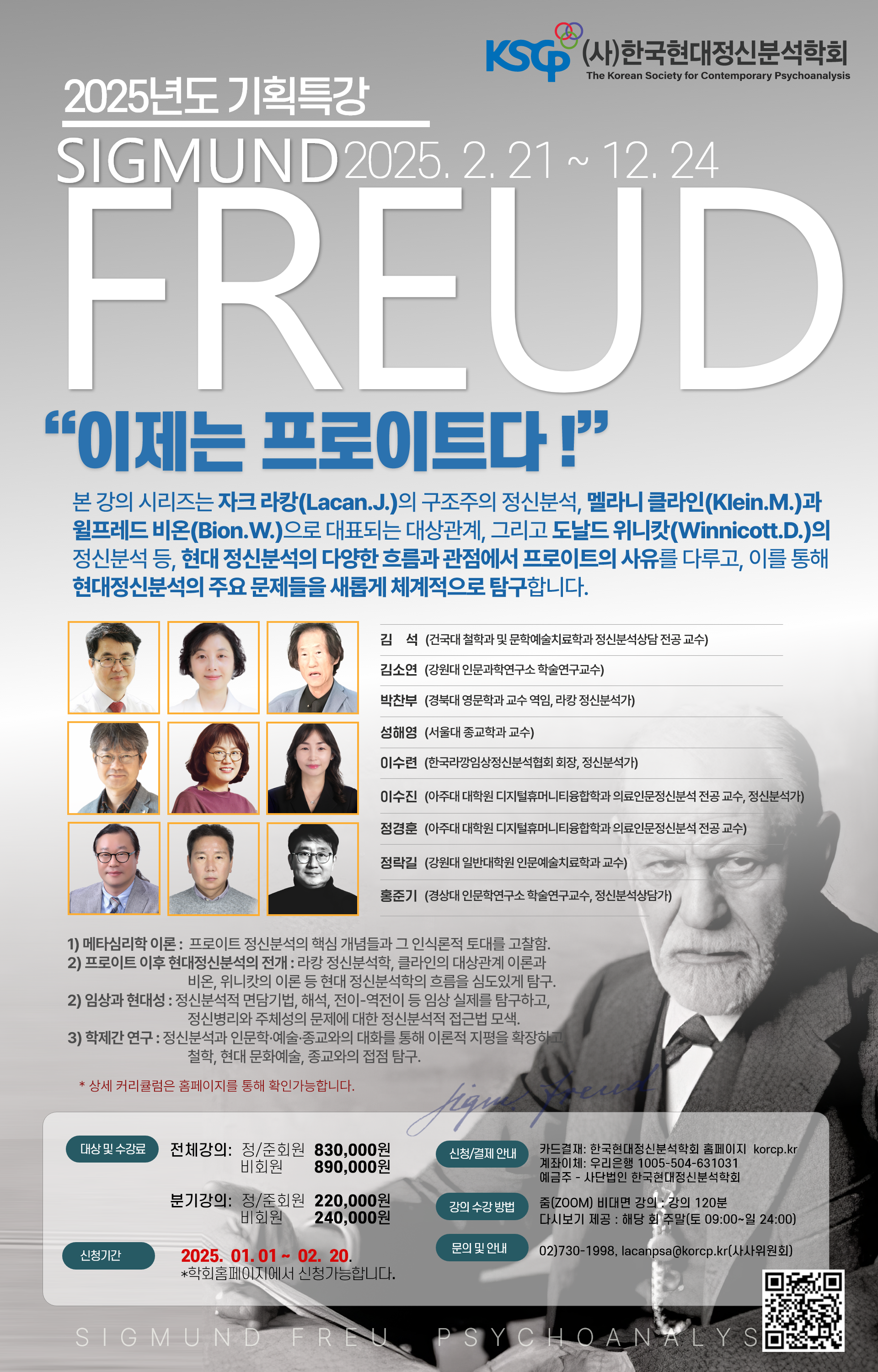 한국현대정신분석학회는 2025년의 대표 기획으로, 지난해 성공적으로 수행한 "에크리 언박싱"의 후속 프로젝트이자 정신분석 이론의 근간을 이루는 특별 강의 시리즈 "이제는 프로이트다!"를 선보입니다.