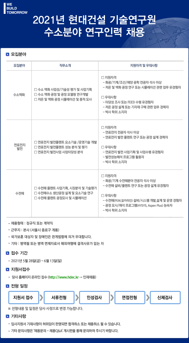 [현대건설 기술연구원] 2021년 현대건설 기술연구원 수소분야 연구인력 채용