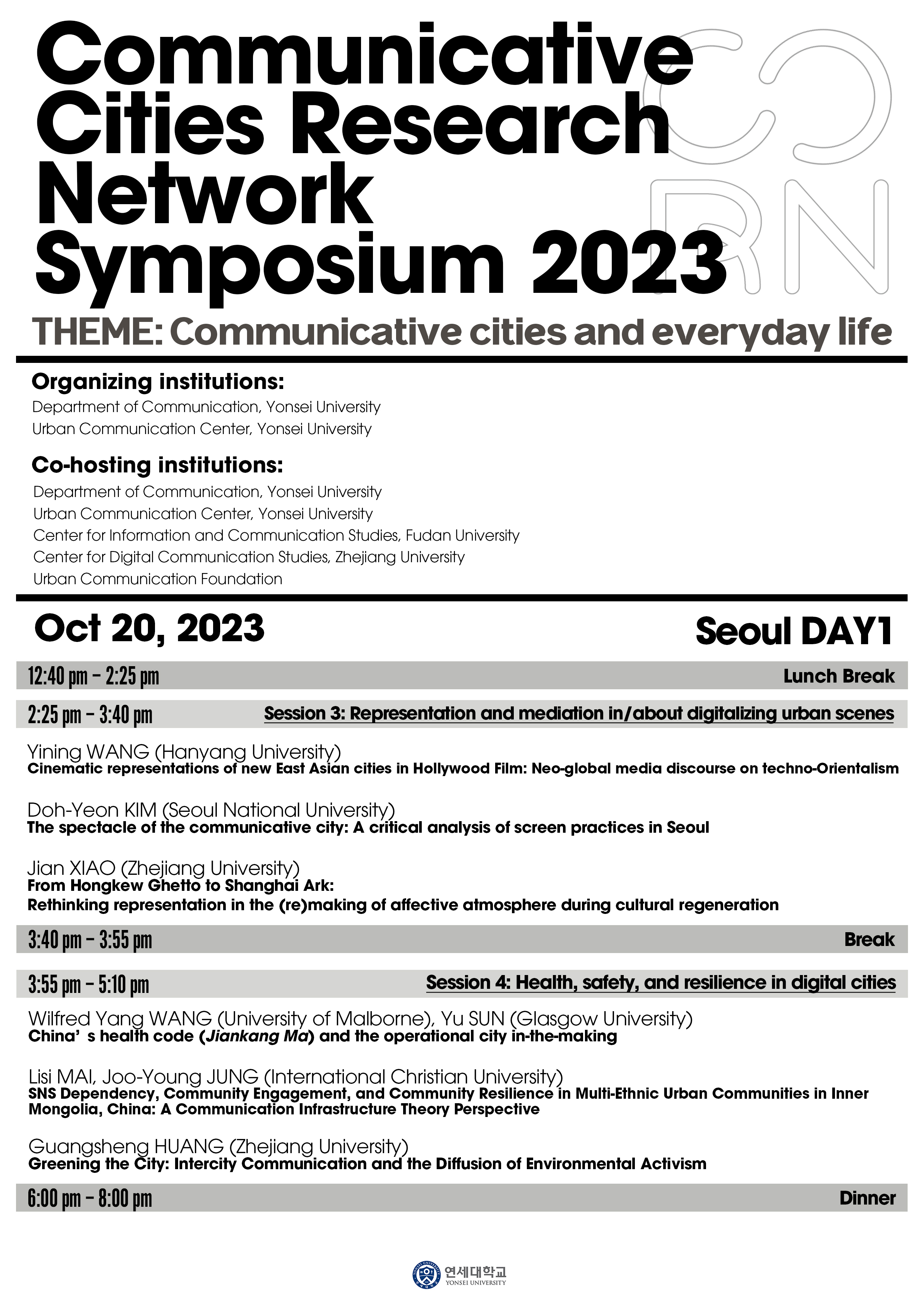 2. 한국언론정보학회는 연세대학교 언론홍보영상학부와 도시커뮤니케이션센터가 개최하는 국제 심포지움 <Communicative Cities Research Network Symposium 2023>을 안내하오니, 회원 여러분의 많은 관심과 참여를 부탁드립니다.
