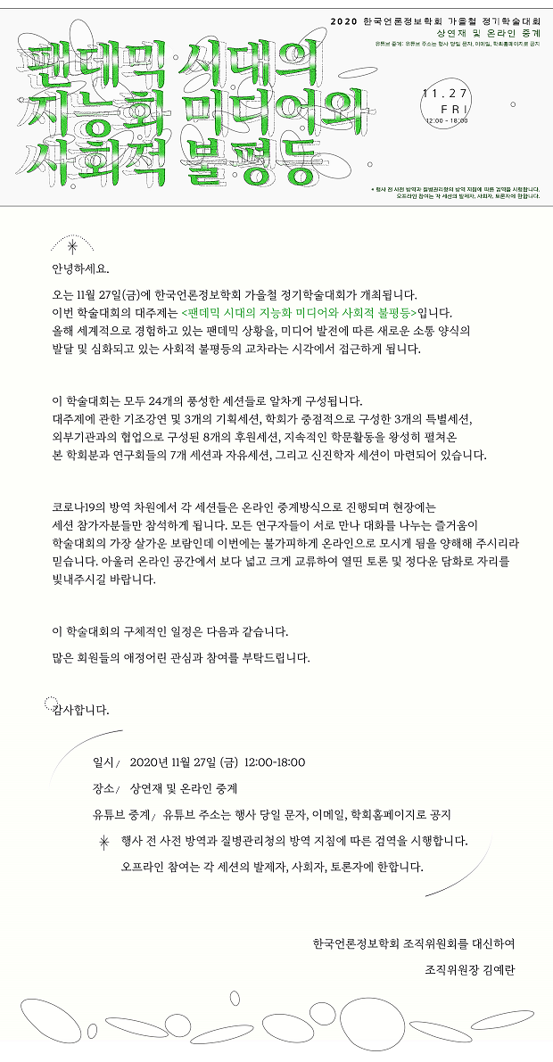 2. 한국언론정보학회는 2020 한국언론정보학회 가을철 정기학술대회 <팬데믹 시대의 지능화 미디어와 사회적 불평등>을 다음과 같이 개최하오니, 회원 여러분의 많은 관심과 참여를 부탁드립니다. 감사합니다.