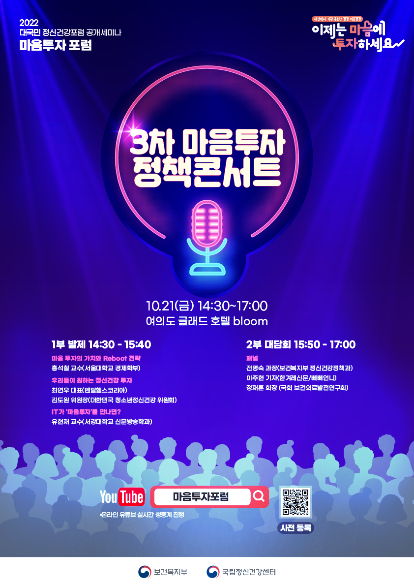 국립정신건강센터에서 2022 대국민 정신건강포럼 공개세미나 마음투자포럼 3차 마음투자정책콘서트를 개최하여 안내드립니다.