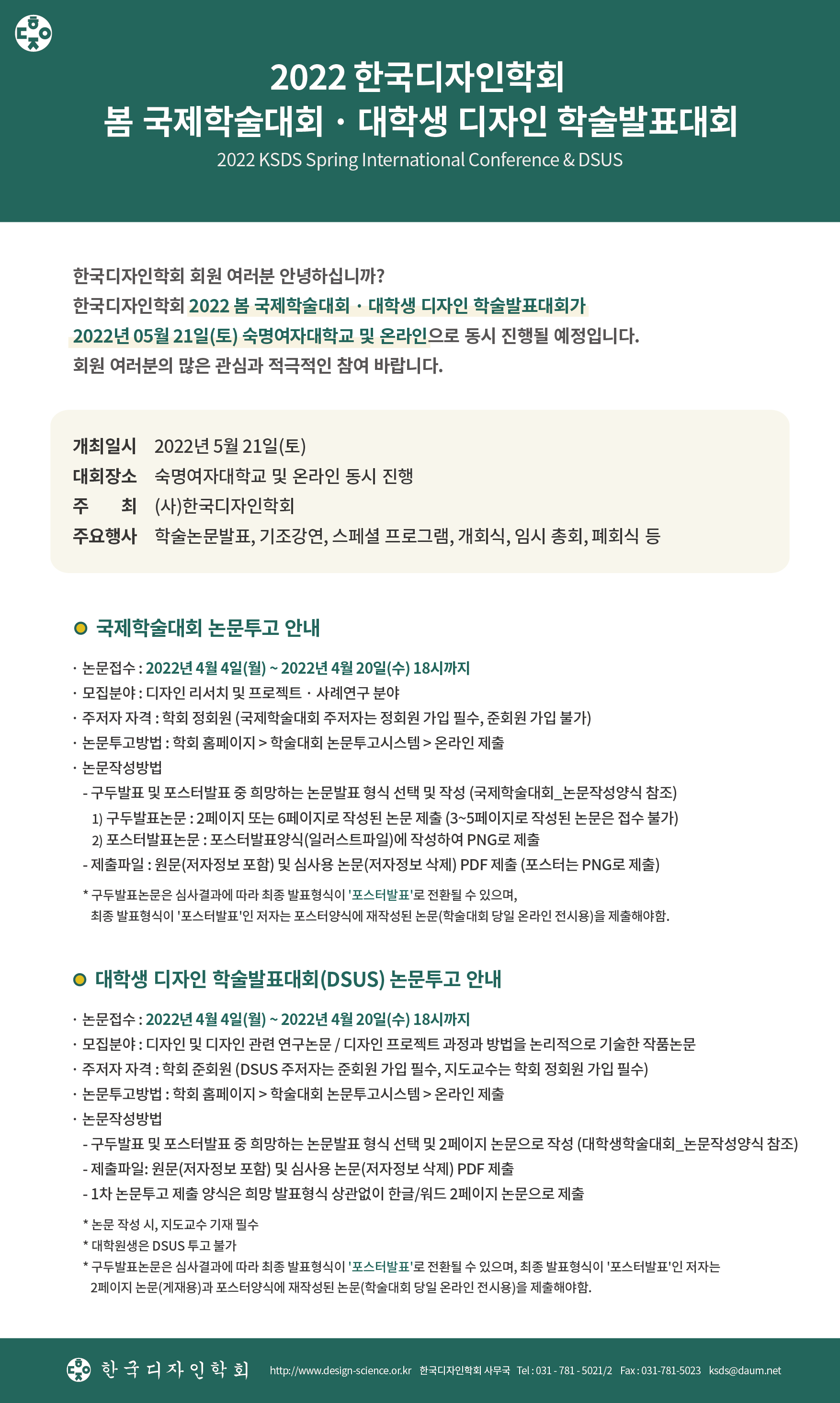 2022 봄 국제학술대회 · 대학생 디자인 학술발표대회 논문 접수 마감일 연장 안내(~4/20)