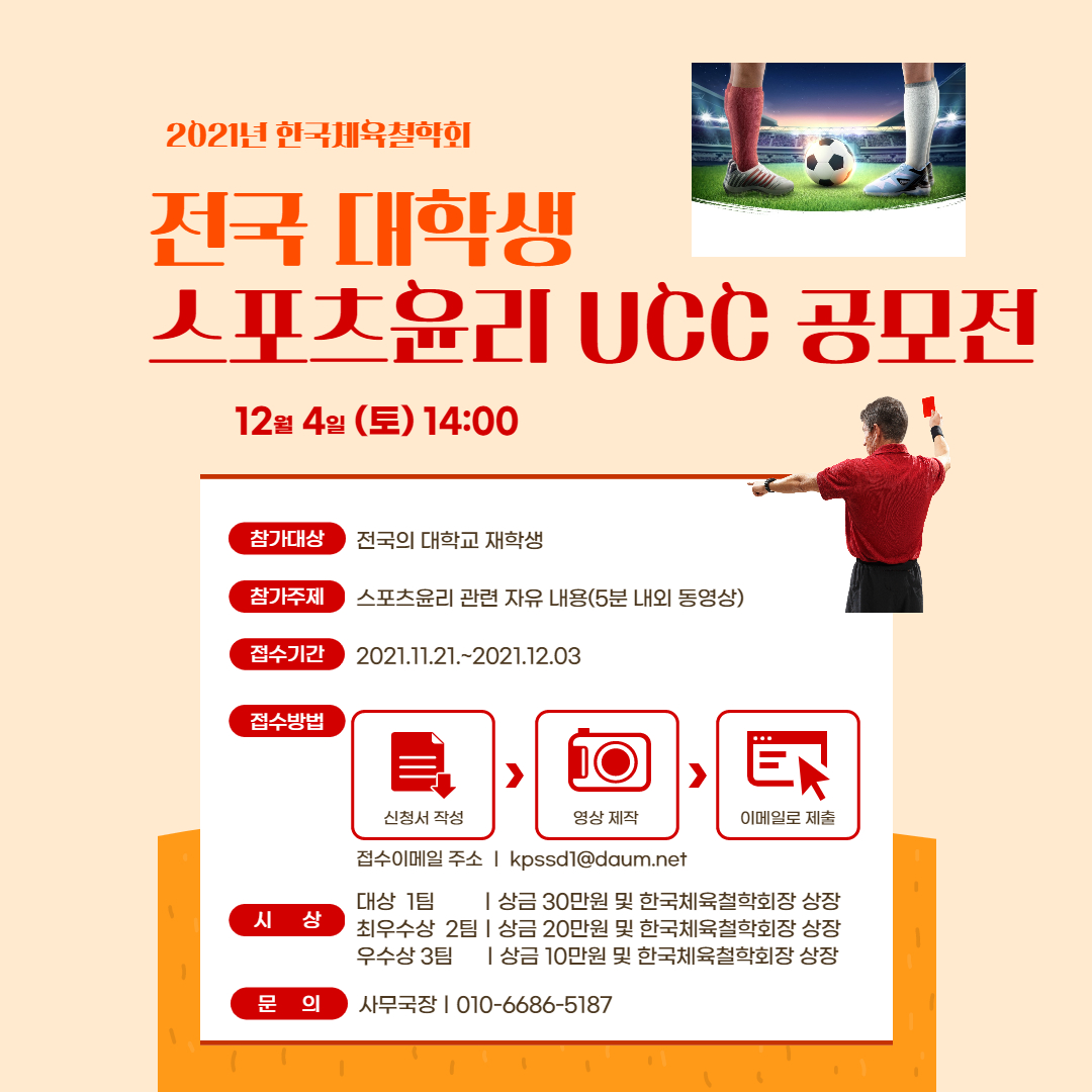 한국체육철학회에서는 전국 대학생 스포츠윤리 UCC 공모전을 실시하고자 하오니, 많은 관심과 참여 부탁드립니다.